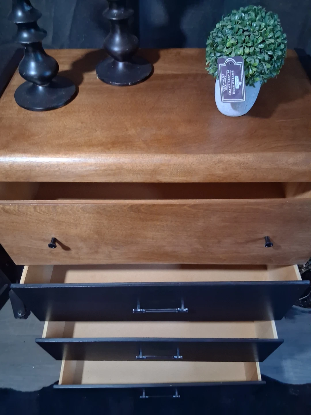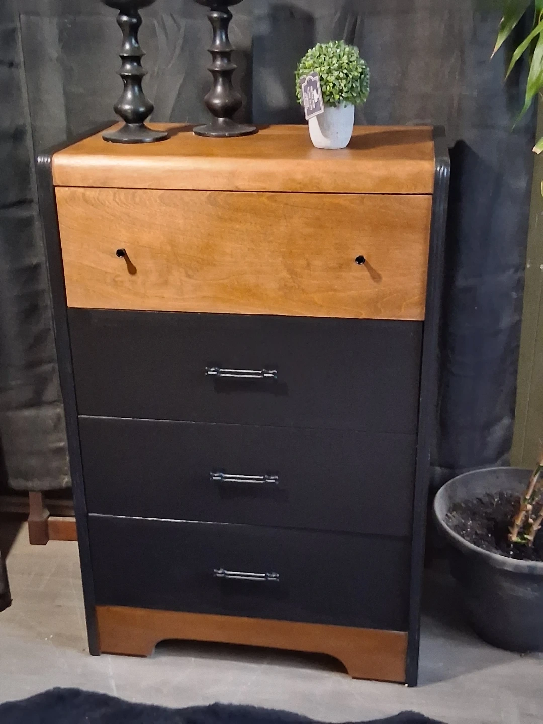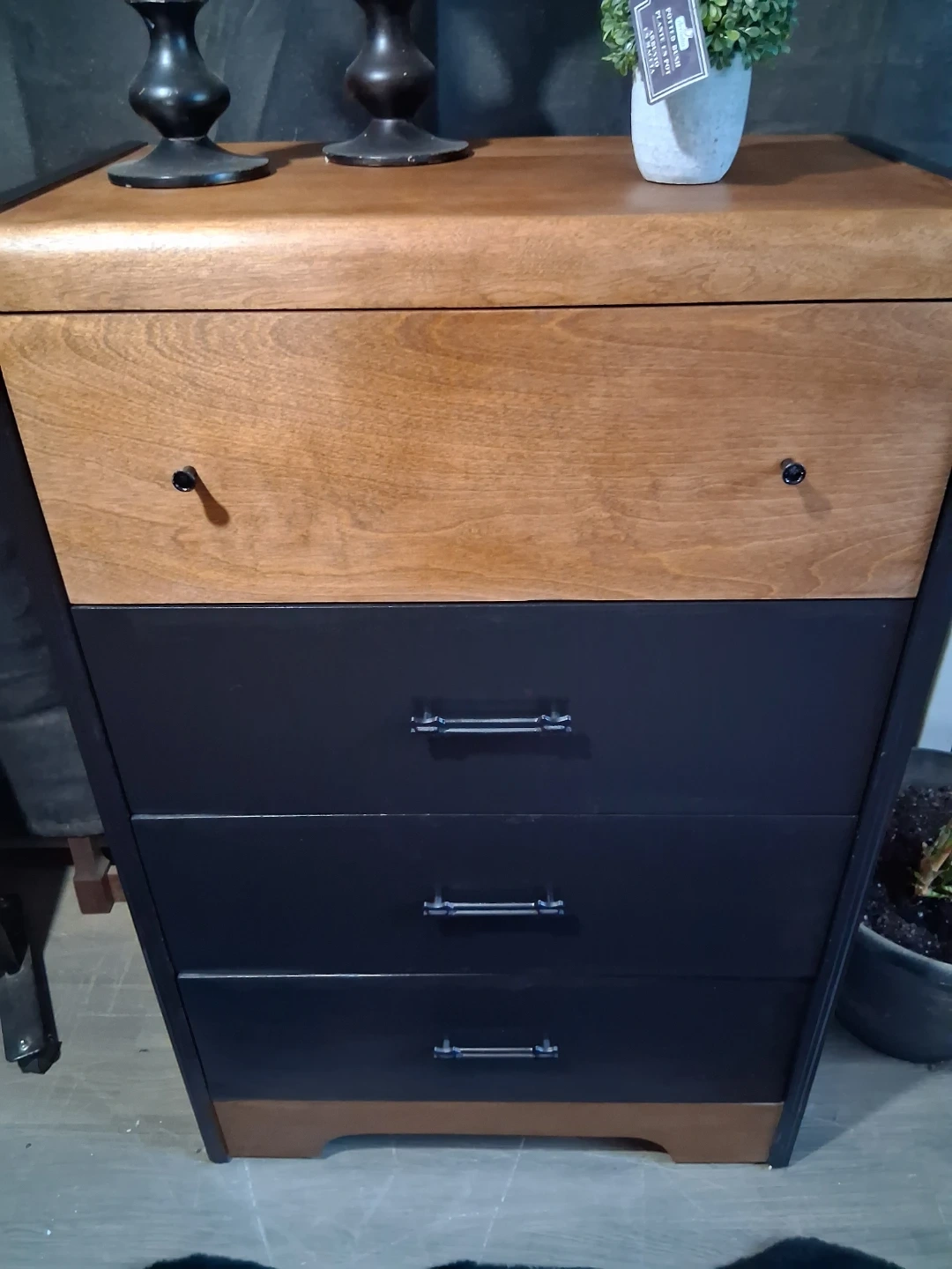 65Custom Vintage Waterfall Dresser Stained with Minwax provincial painted with Behr black satin, coated with multiple layers of polyurethane for protection and durability. Measurements:27"1/2Wx16"Dx42"H $150 Smoke free pet friendly home