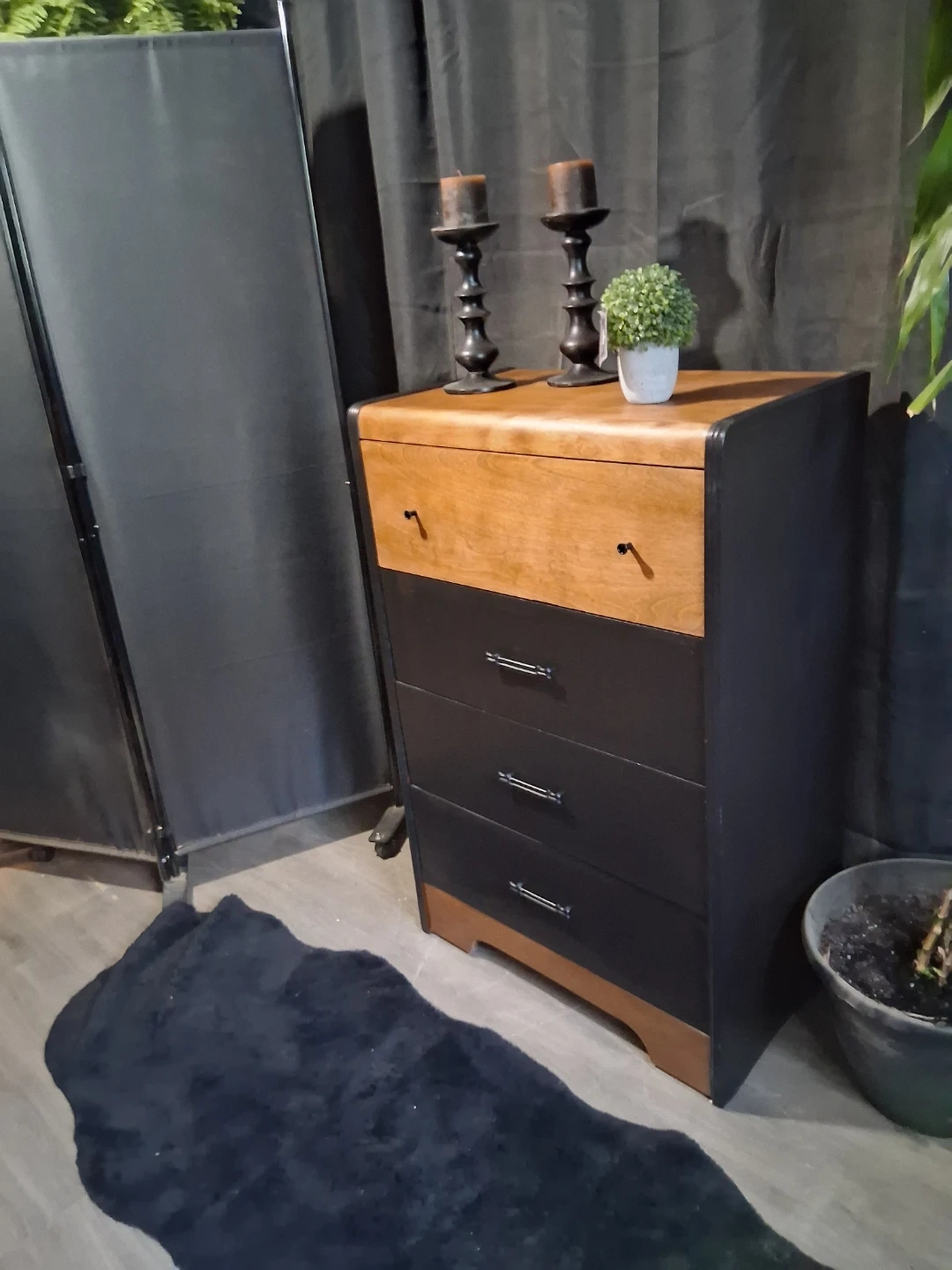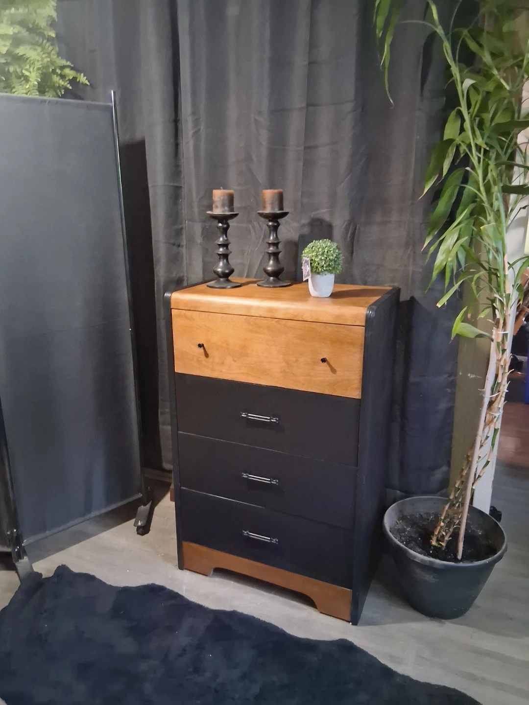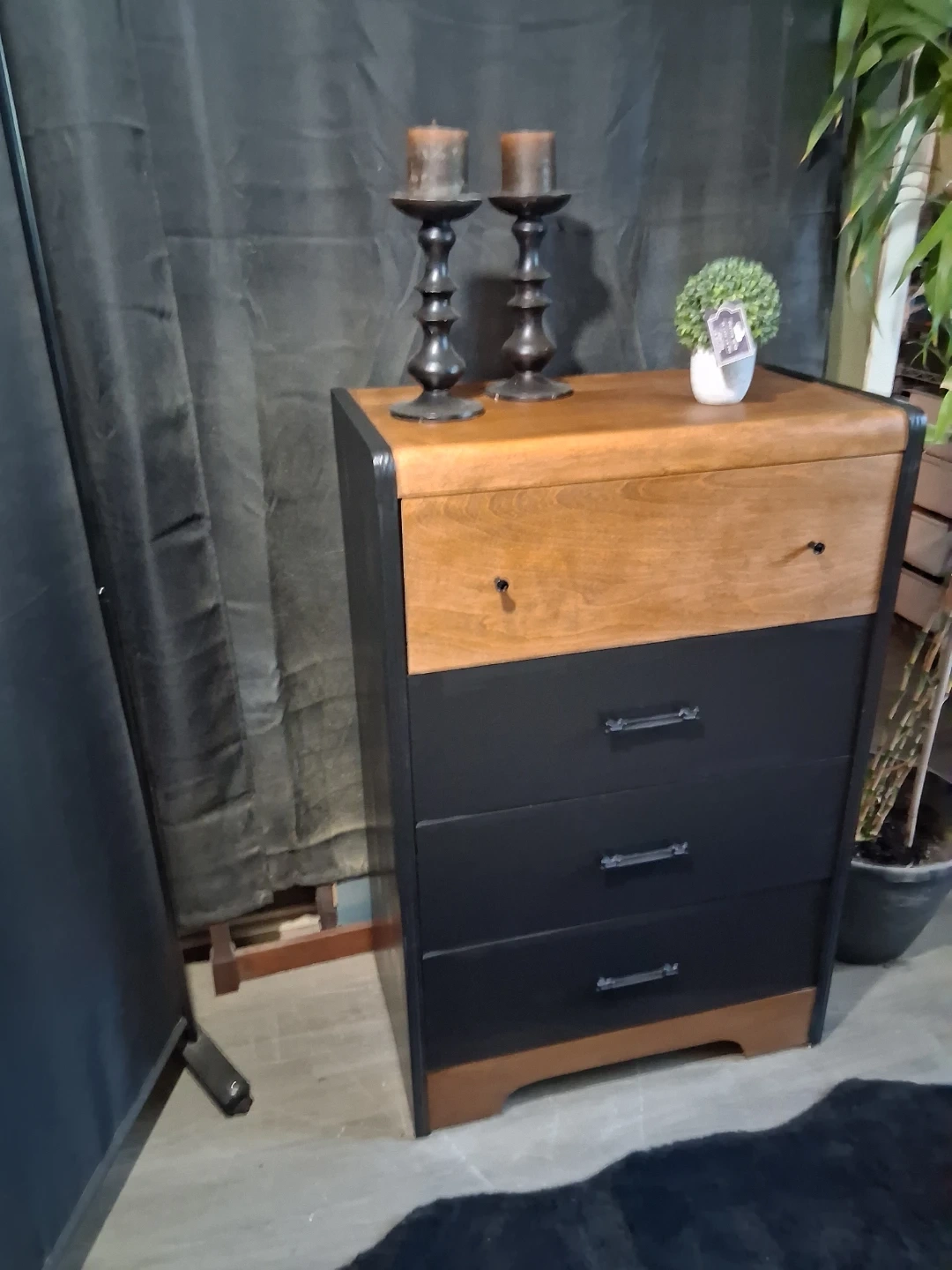 65Custom Vintage Waterfall Dresser Stained with Minwax provincial painted with Behr black satin, coated with multiple layers of polyurethane for protection and durability. Measurements:27"1/2Wx16"Dx42"H $150 Smoke free pet friendly home