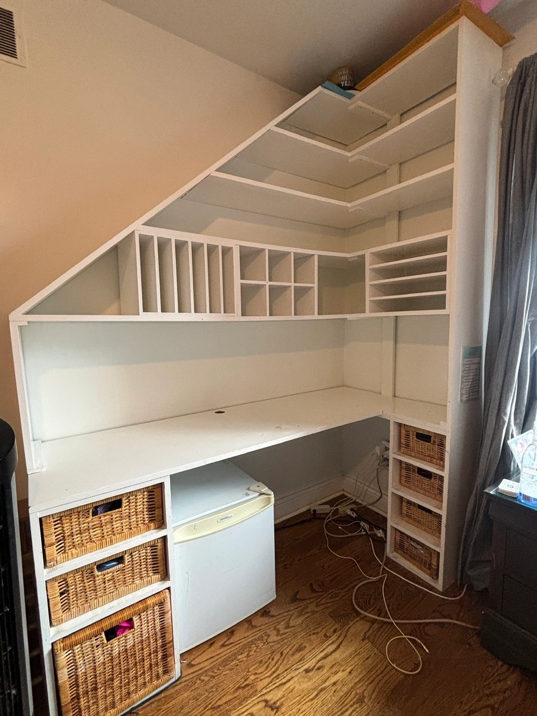 Selling a unique, custom-built corner desk! It features lots of shelving and storage baskets. It's perfect for a home office or study space, especially if you're looking to maximize space in a room with an angled ceiling.