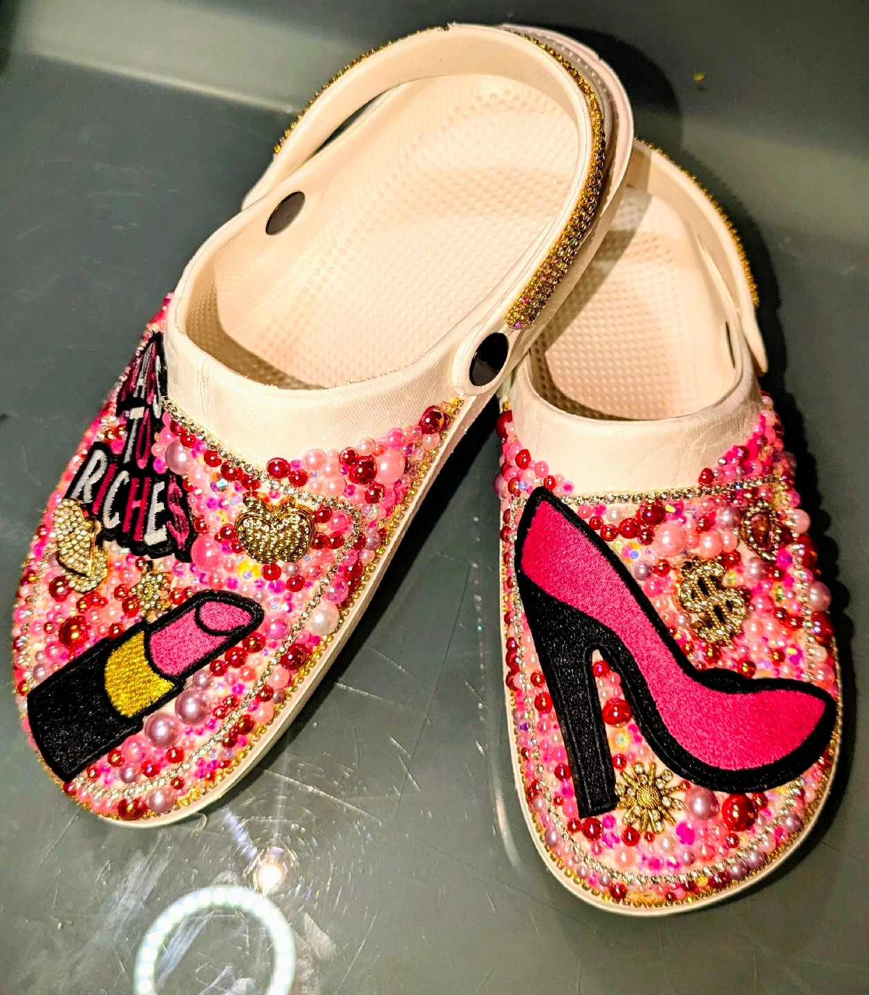 25These are a pair of customized Crocs, decorated with various beads, rhinestones, and patches. They feature designs like a lipstick tube, a high heel shoe, and other decorative elements. These Crocs are sure to make a statement!