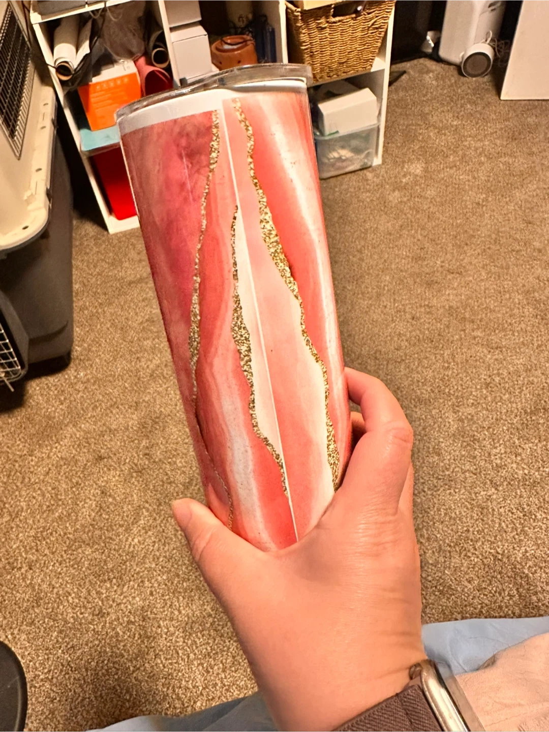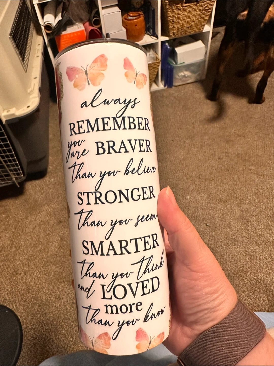 I'm selling a customized tumbler with a motivational quote and butterfly design. It's in great condition and ready for a new home!