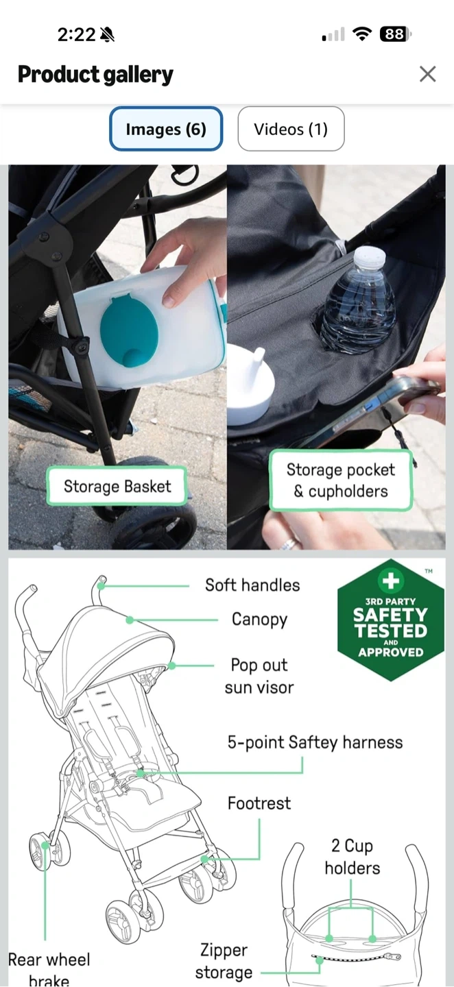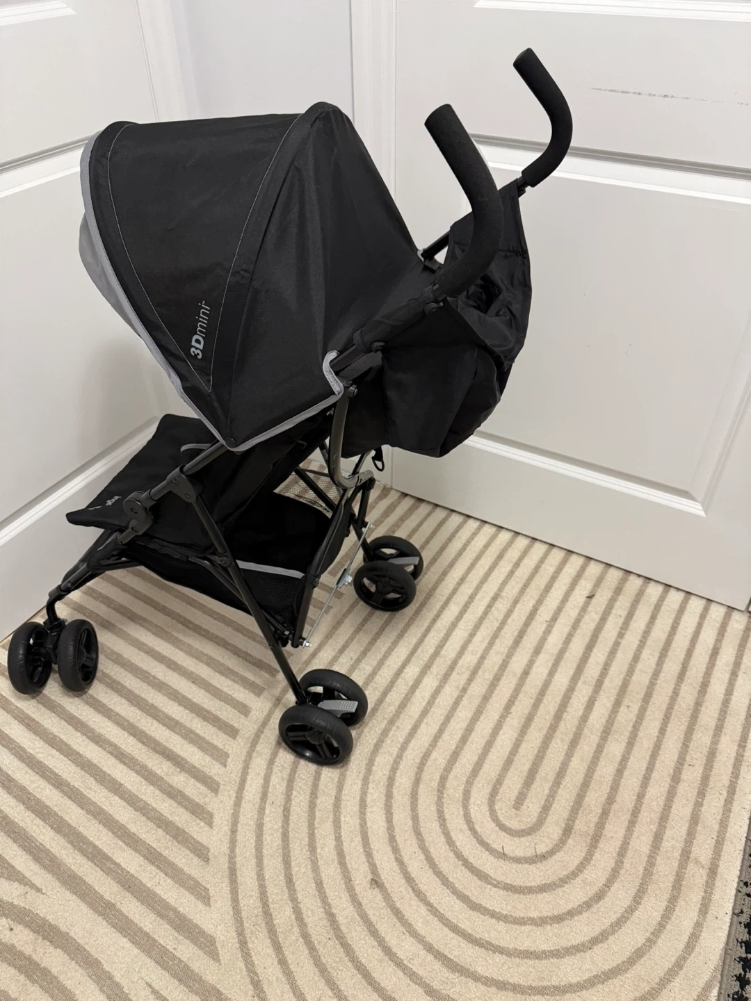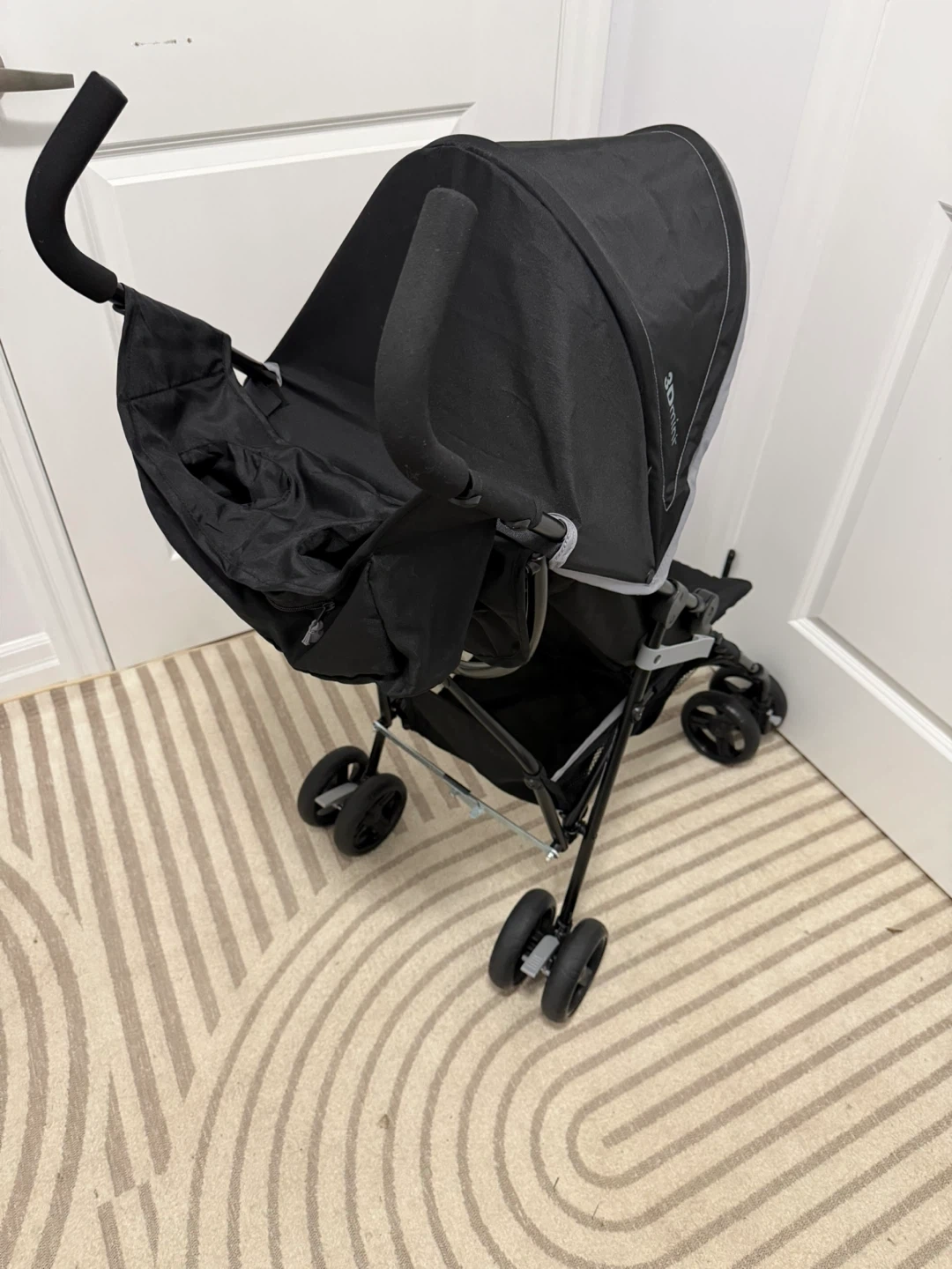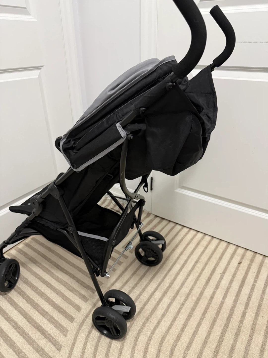 Compact folding stroller, lightweight and easy to carry. Good for travel, shopping trips, or everyday use.