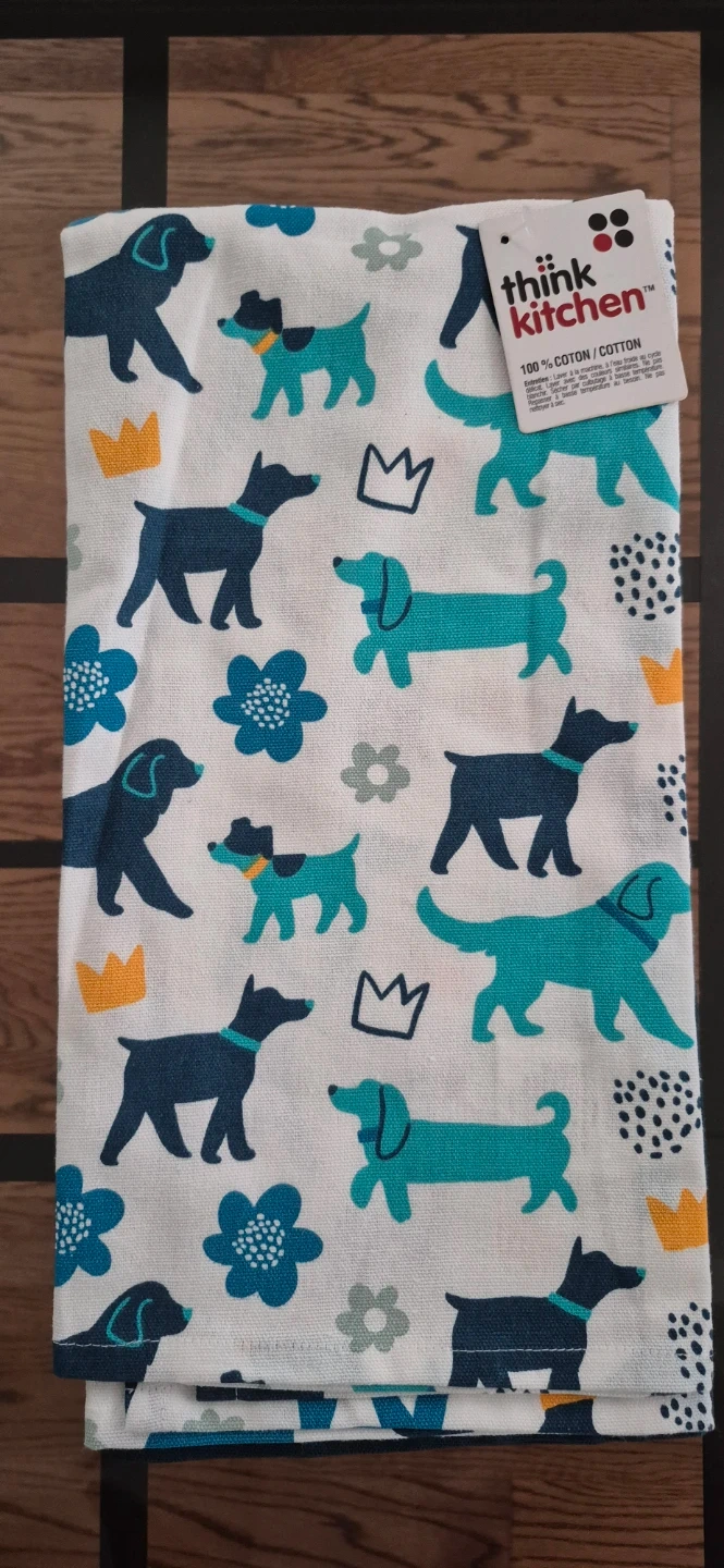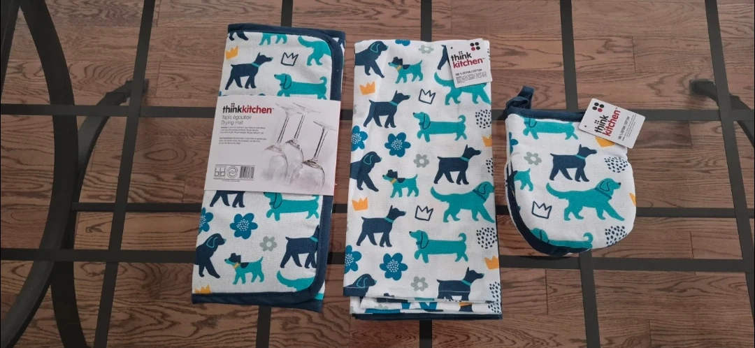 103This is a new Think Kitchen dish drying mat set! It includes a drying mat, dish towel, and oven mitts, all with a cute dog pattern. Perfect for adding a touch of fun to your kitchen! Makes for the perfect Christmas gift.