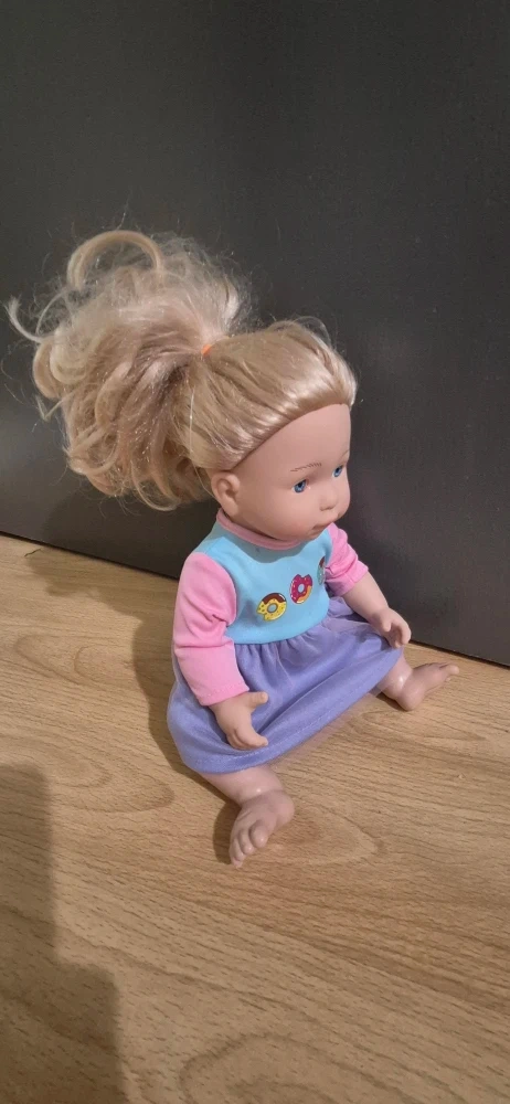 0Selling a cute doll with blonde hair in a ponytail. She's wearing a light blue and pink shirt with a purple skirt. She's in good condition and ready for a new home!