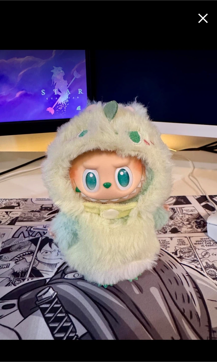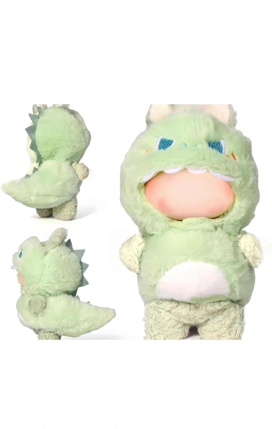 This is an adorable plush doll dressed in a dinosaur costume. It's a soft, cuddly toy with a fluffy green exterior and cute facial features. Perfect for kids or anyone who loves cute plushies!