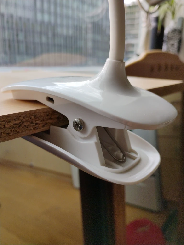 82Here's a Midea clip-on LED light. Touch control in 3 settings. It's perfect for desk or bedside table. It is lightweight and portable. Charging wire included.
