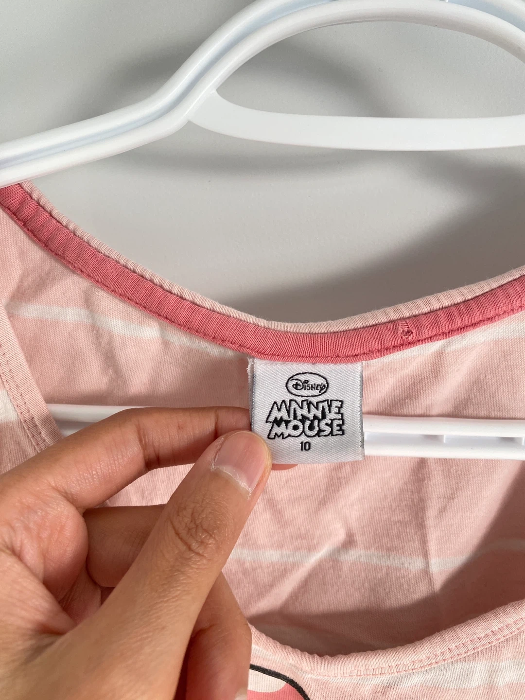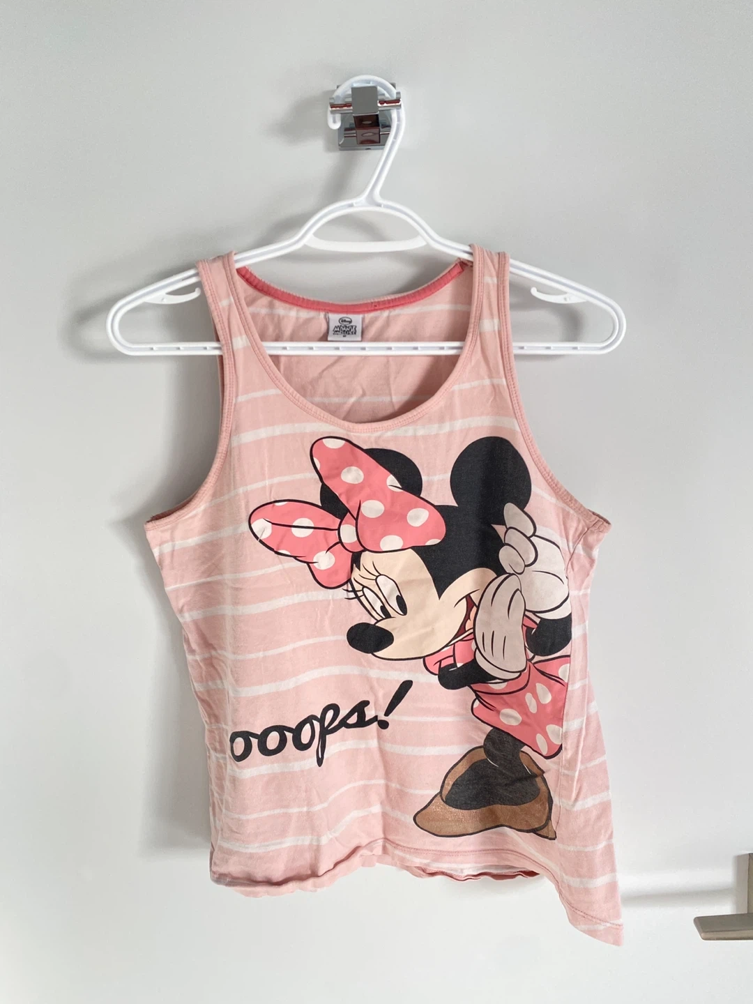 Selling a cute Disney Minnie Mouse tank top! It's a size 10 (fits medium) and features a fun Minnie Mouse design on a pink and white striped background. Perfect for any Disney fan and ready for a new home! ❤️ Check out my other listings for great deals!