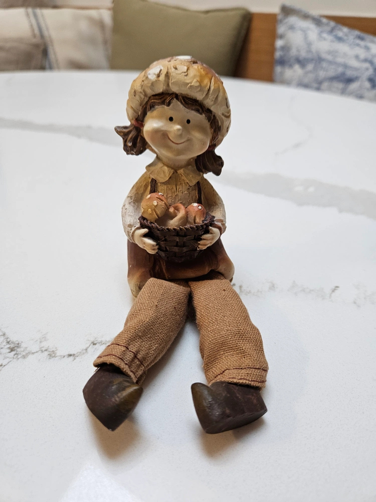 Selling this adorable mushroom girl figurine! She's in great condition and would look lovely on a shelf or desk. She's holding a basket of mushrooms, making her extra cute!