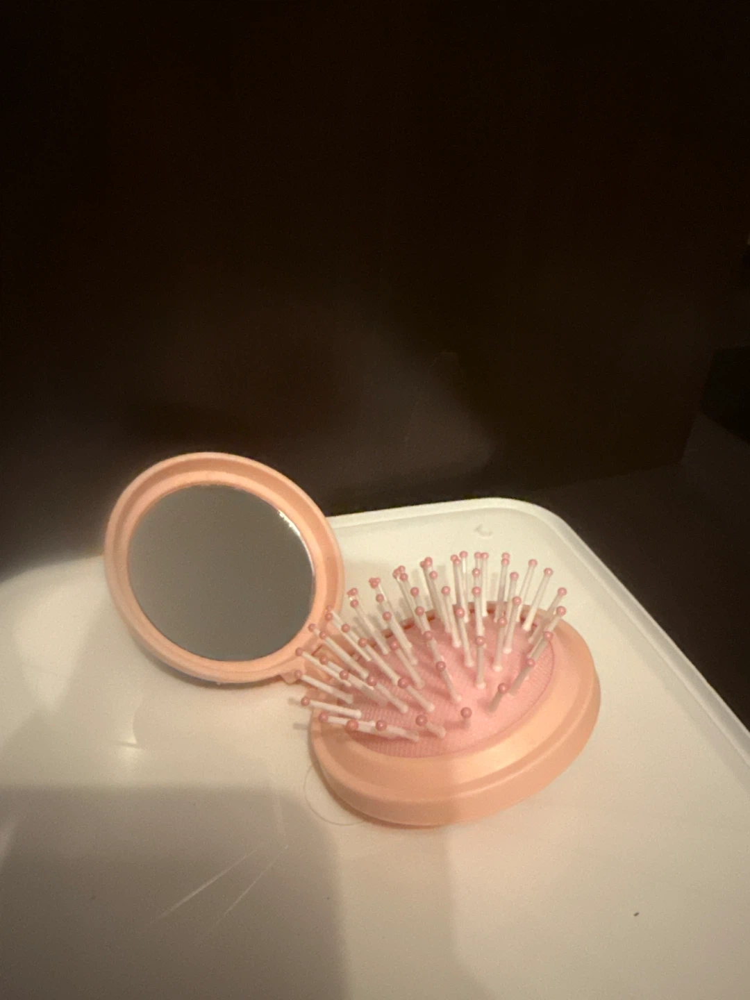 60Selling a cute mini hair brush in pink! It's small enough to fit in your purse or backpack. It also has a mirror inside, perfect for quick touch-ups on the go