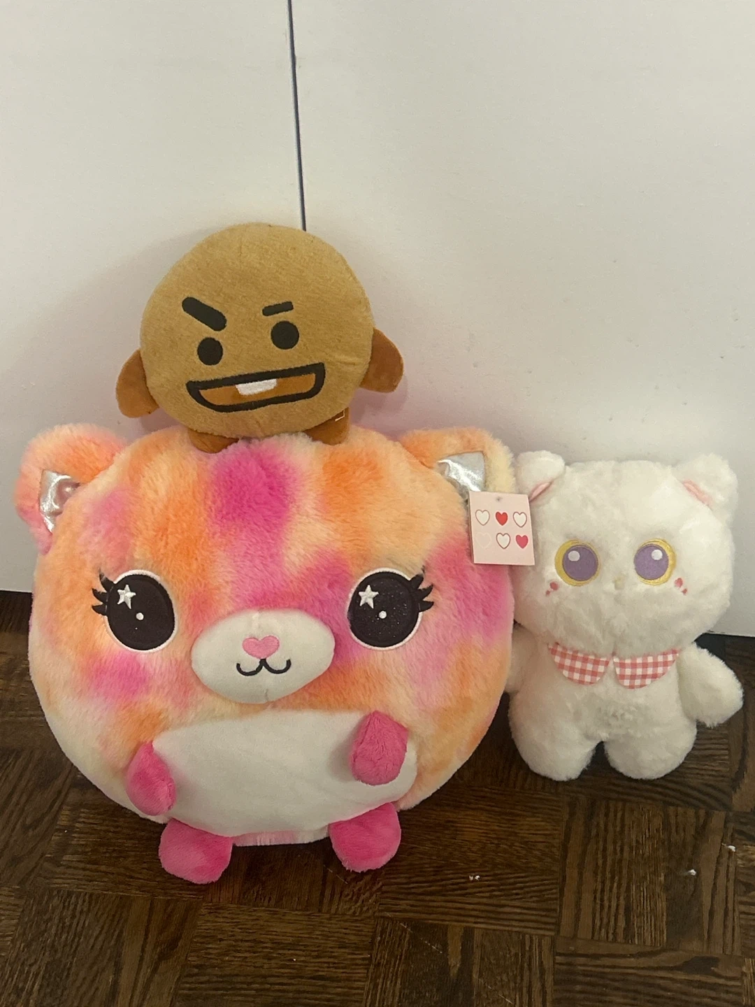 Selling these adorable plush toys! Shoppers big plushie, cookie, a white adorable cat.
