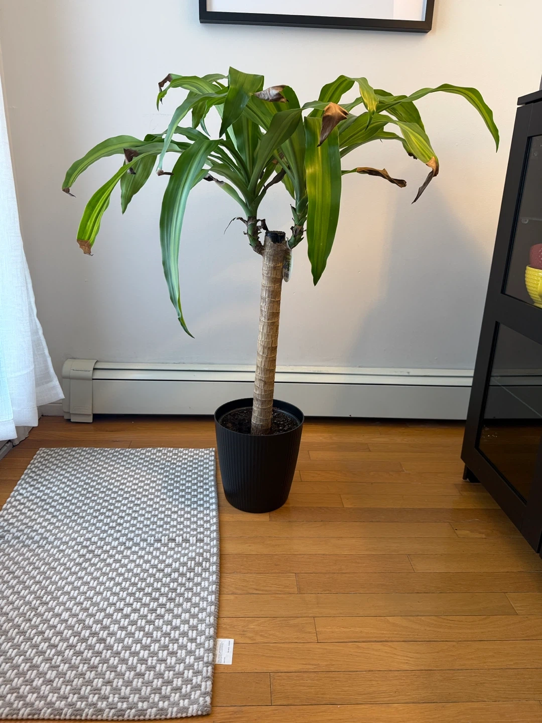 A Dracaena Fragrans plant in a black pot. Its leaves are green with yellow variegation. It's a great houseplant for adding some greenery to your space. Needs some TLC!