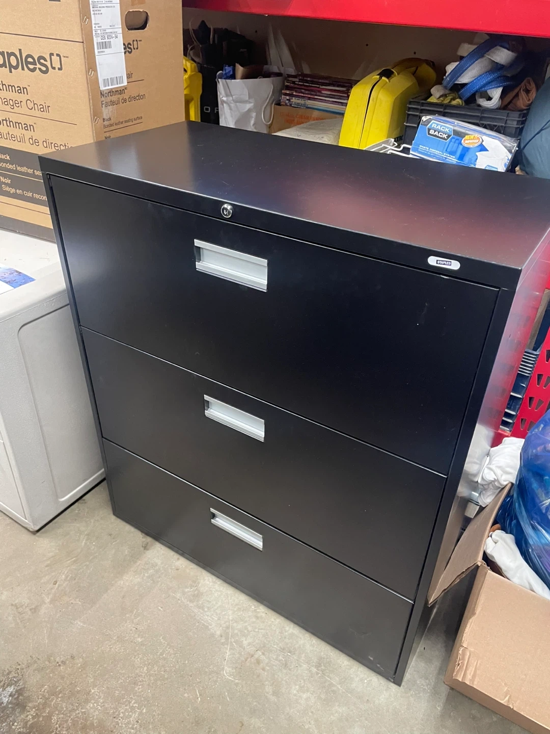 Black metal filing cabinet with three drawers. It's designed for letter-size files and includes a lock for security. This cabinet is great for keeping your office organized. comes from a pet free home at smoke free home $20.