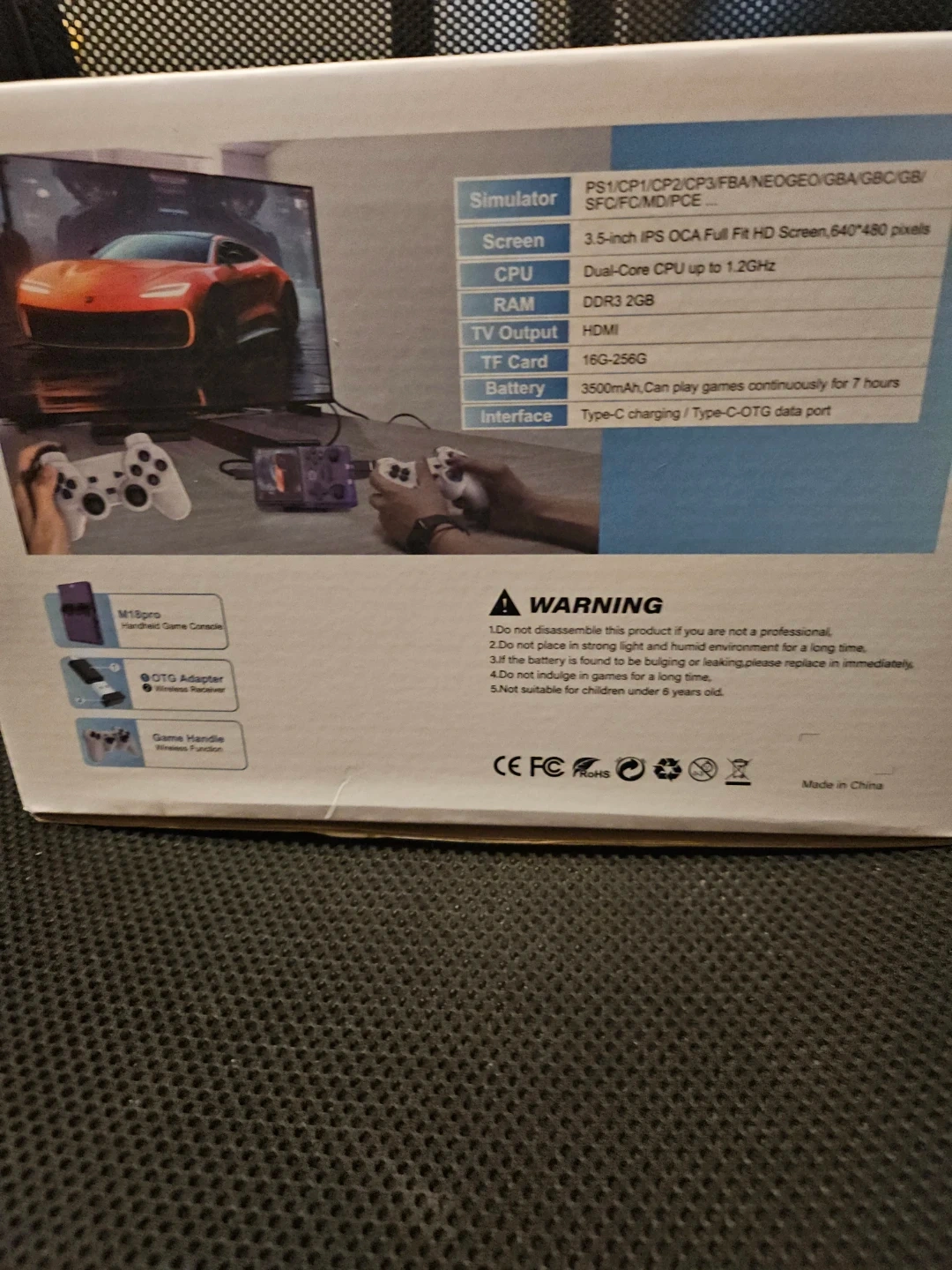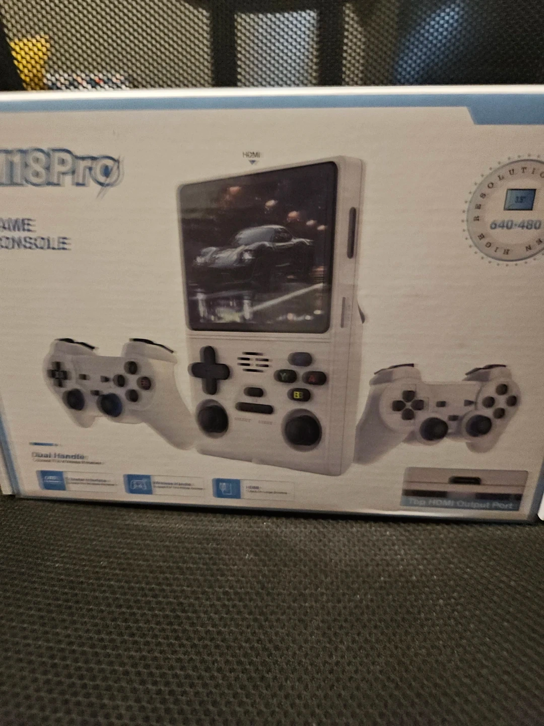 Selling a brand new M18Pro handheld game console! It comes in its original box and includes dual handles. It features a 3.5-inch IPS OCA Full Fit HD Screen with 640*480 pixels. The CPU is a Dual-Core CPU up to 1.2GHz, with 2GB of DDR3 RAM. It supports HDMI TV output and has a 16G-256G TF Card. The 3500mAh battery can play games continuously for 7 hours. It also has a Type-C charging / Type-C-OTG data port