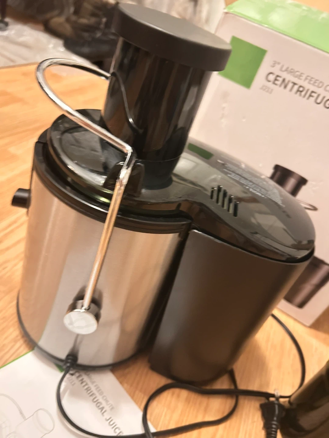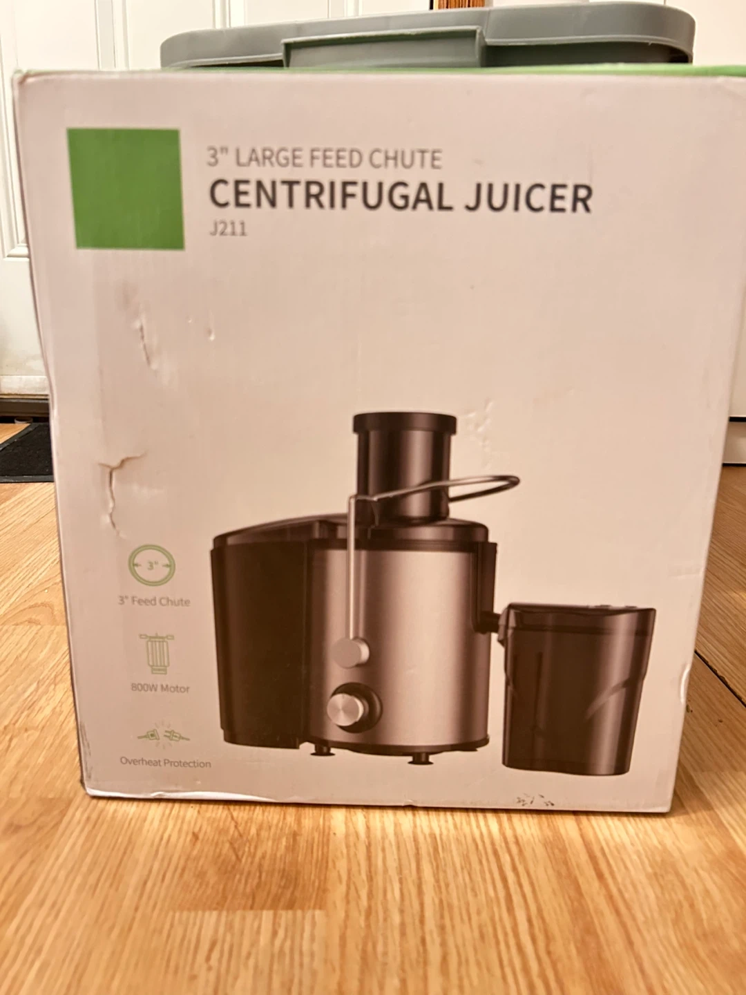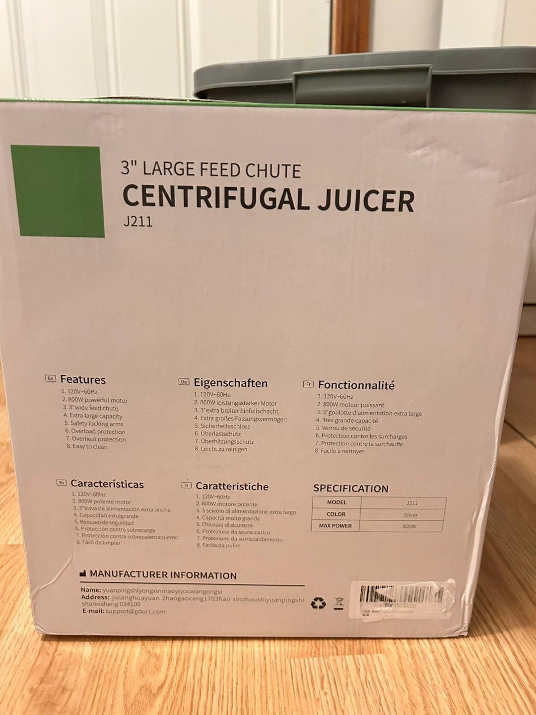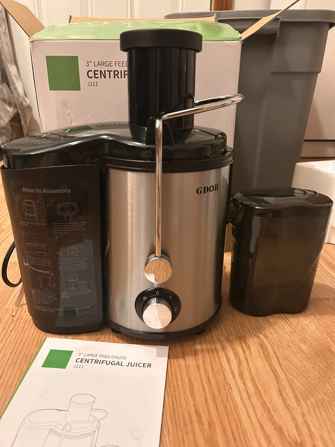 This is a GDOR centrifugal juicer with model J211. It features a 3-inch large feed chute and an 800W motor. The juicer has a silver finish and includes overheat protection. It's designed for efficient juicing.