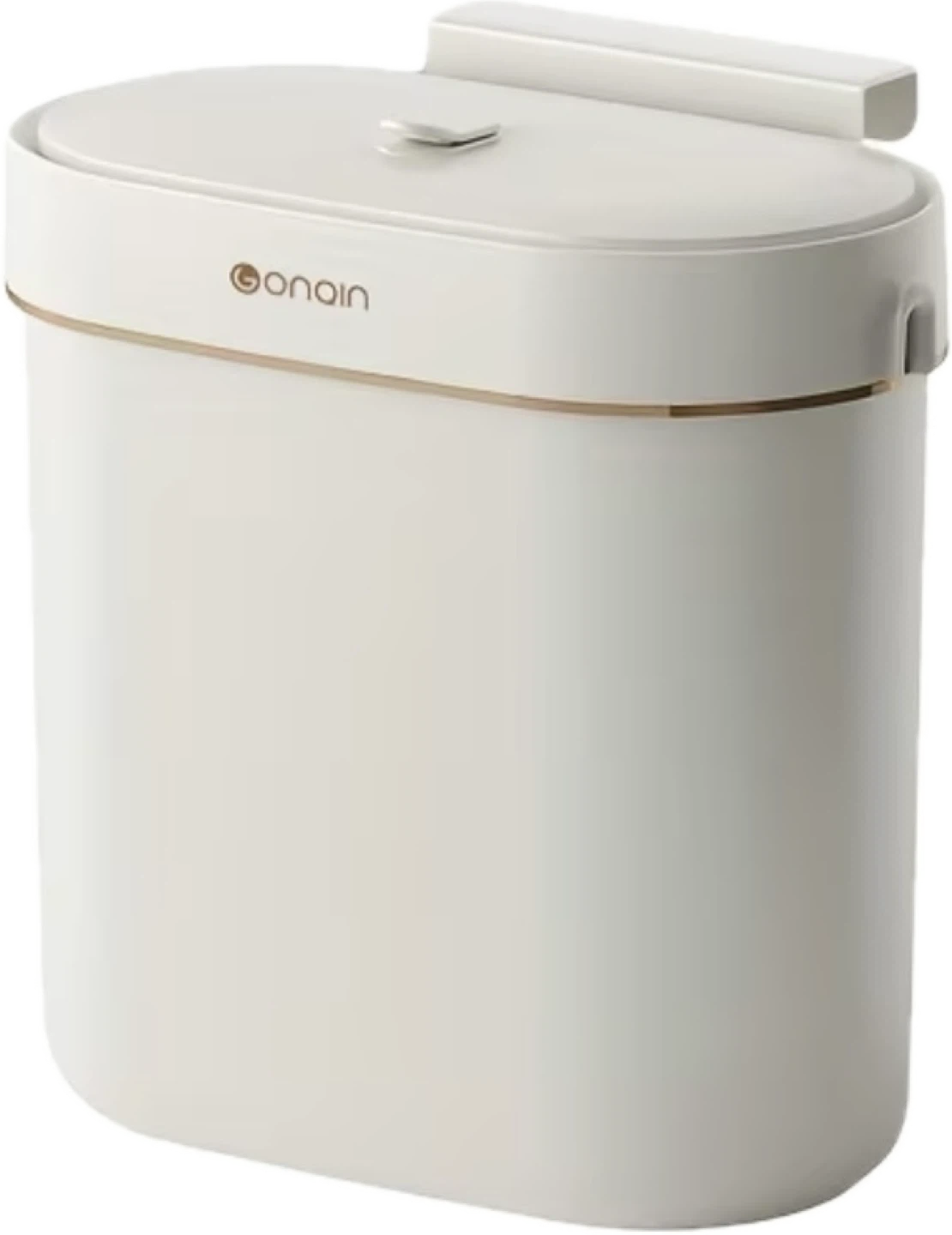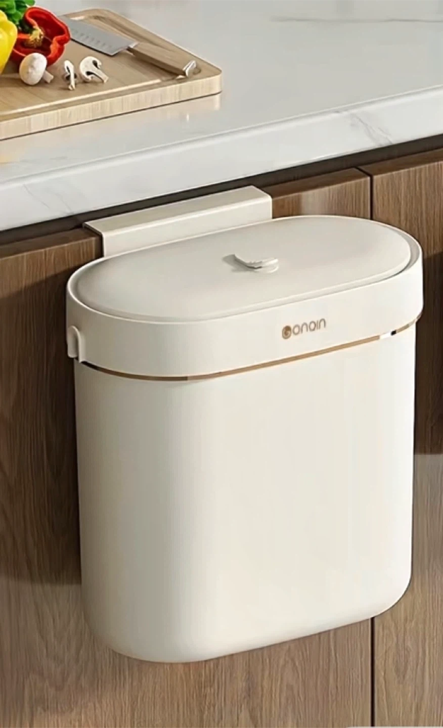 9-litre hanging trash can in white. Made of plastic and measures 28x28x15cm. Two installation methods are included: suspended or hanging. Hanging applicable when the cabinet door thickness is less than or equal to 2.5cm (fits most cabinet doors). Brand new.