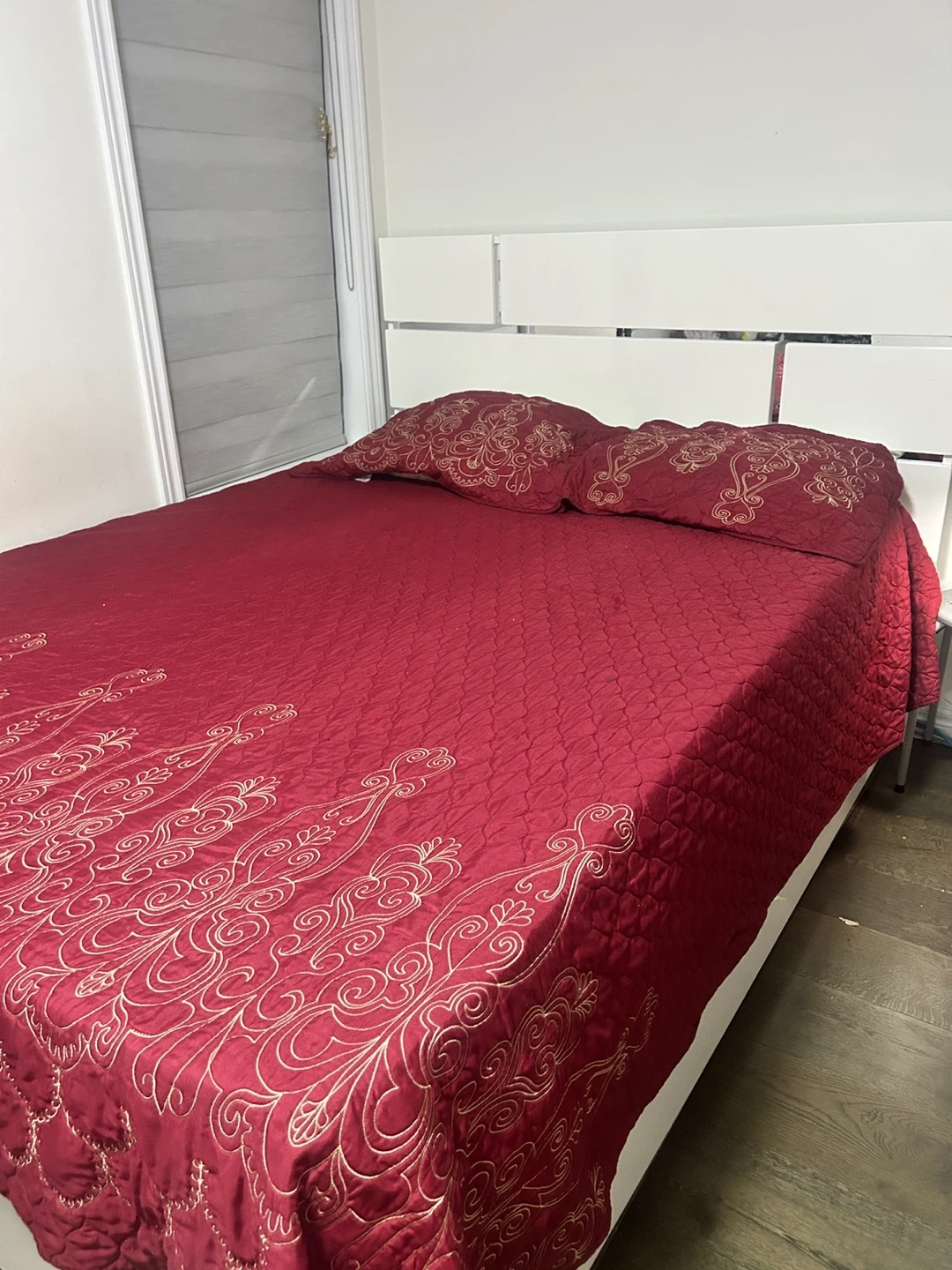 White modern queen bed frame with a stylish headboard. Adds a touch of elegance to any bedroom! Mattress and duvet not included only bed frame!