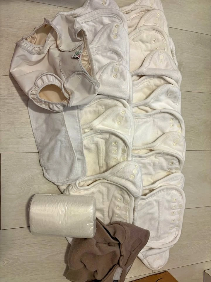Good used condition Motherease fitted diaper lot. Includes 11 one size fitted diapers, 1 wool cover, 1 unopened liner pack, 2 liners, and 1 diaper cover with velcro.