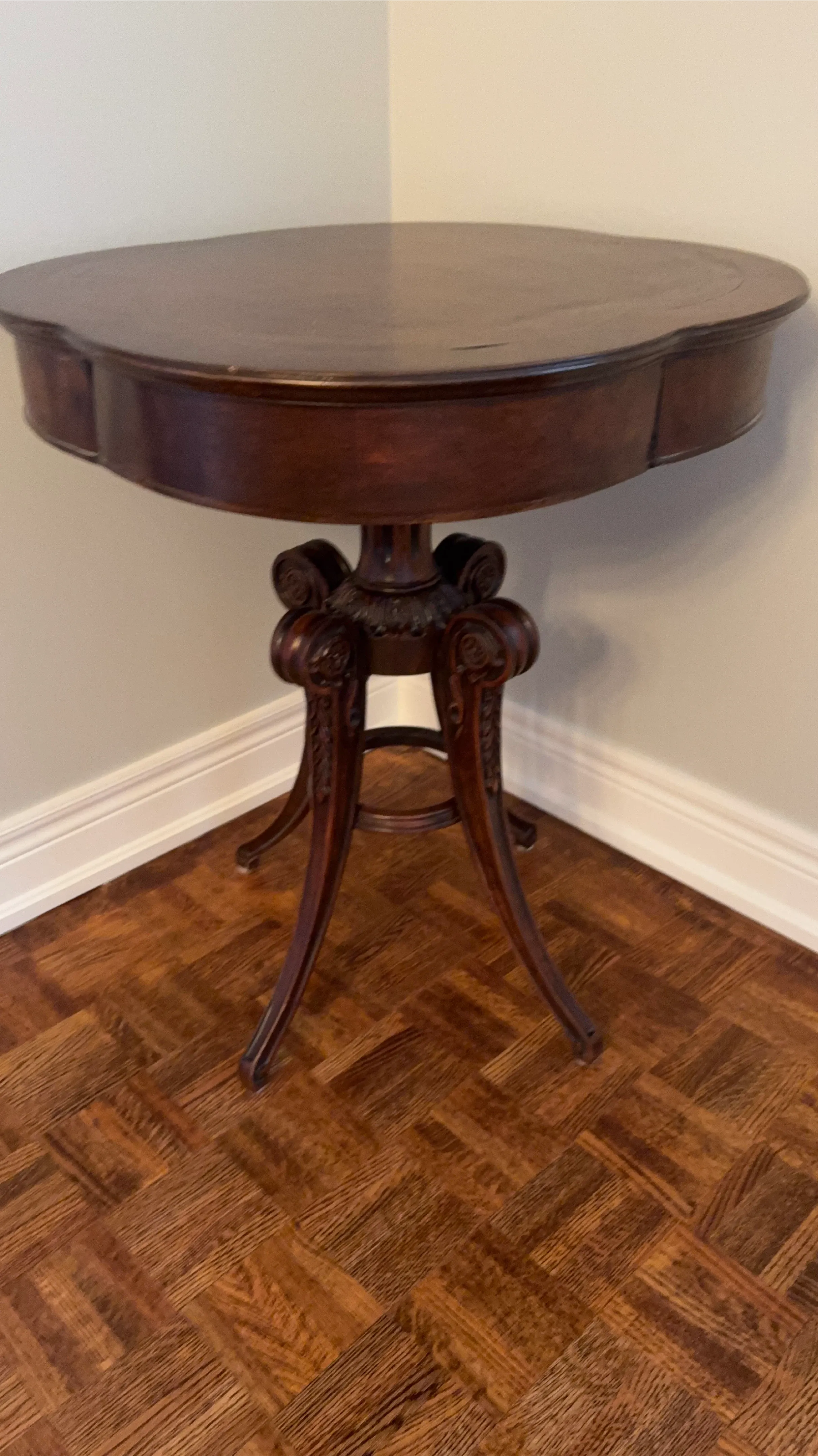 A beautiful antique wooden pedestal table with intricate carvings on its base and legs. Its rich, dark wood finish complements its elegant, curved tabletop. This piece would make a lovely accent table in any room.