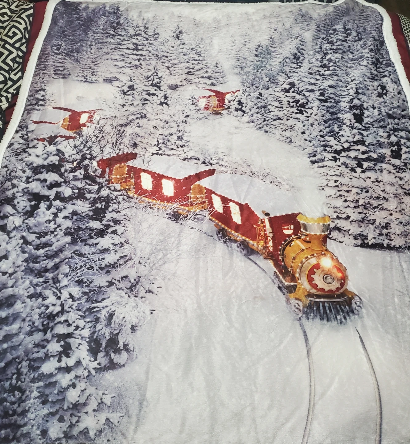 Cozy fleece blanket featuring a festive Christmas train scene. The blanket's design shows a train traveling through a snowy forest, complete with lit windows on the carriages. It's perfect for adding a touch of holiday cheer to your home. Likely made from soft polyester material.
