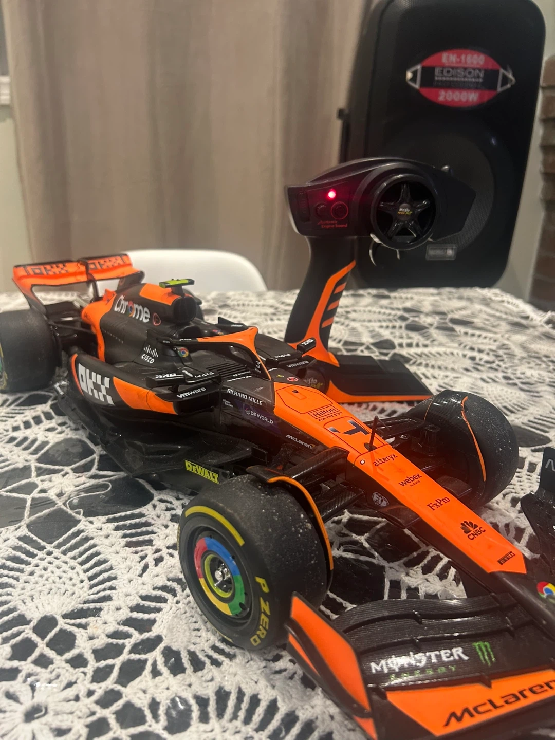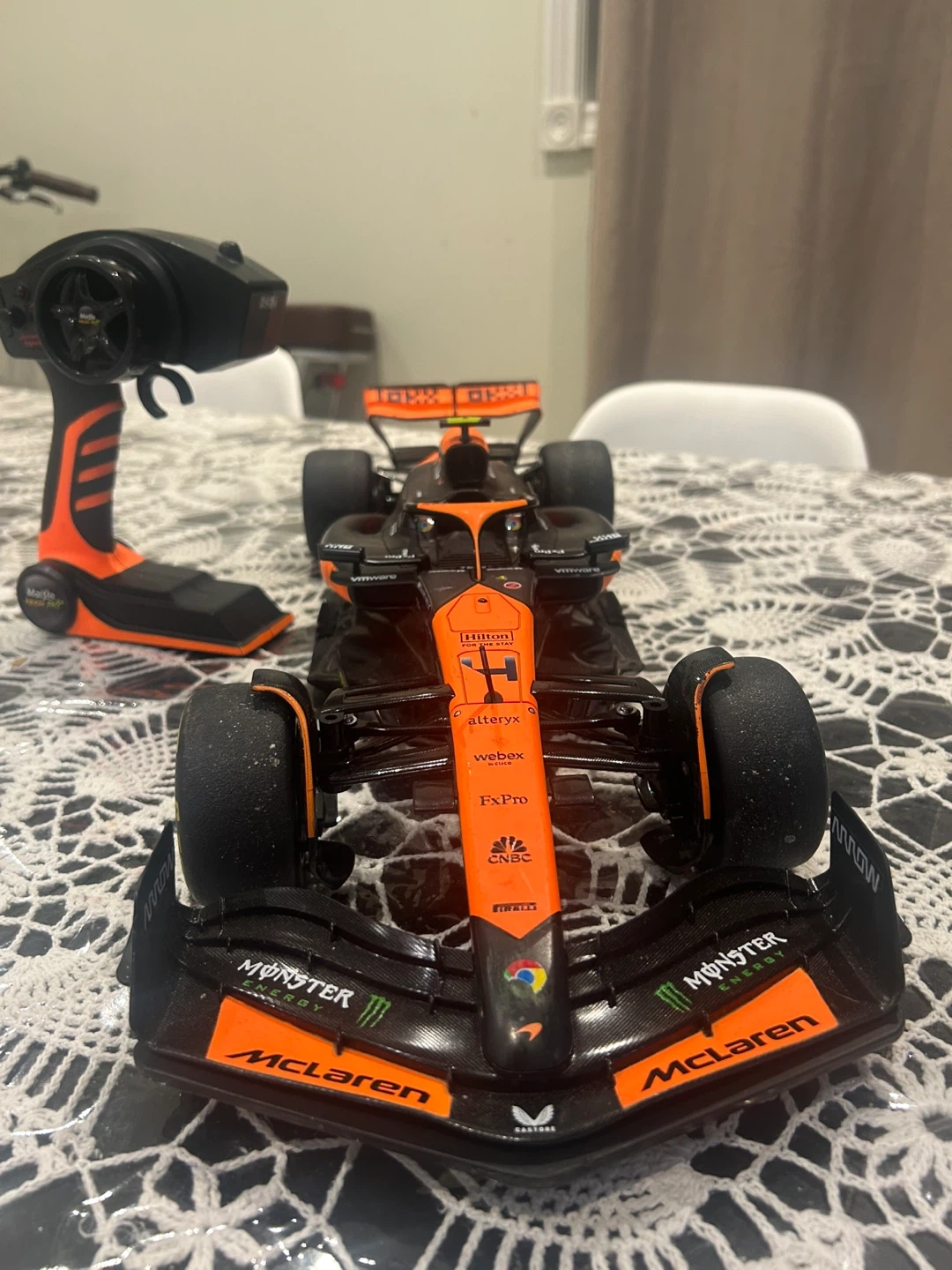 This is a remote-controlled McLaren Formula 1 race car. It comes with a remote for easy operation. Fun for racing enthusiasts!