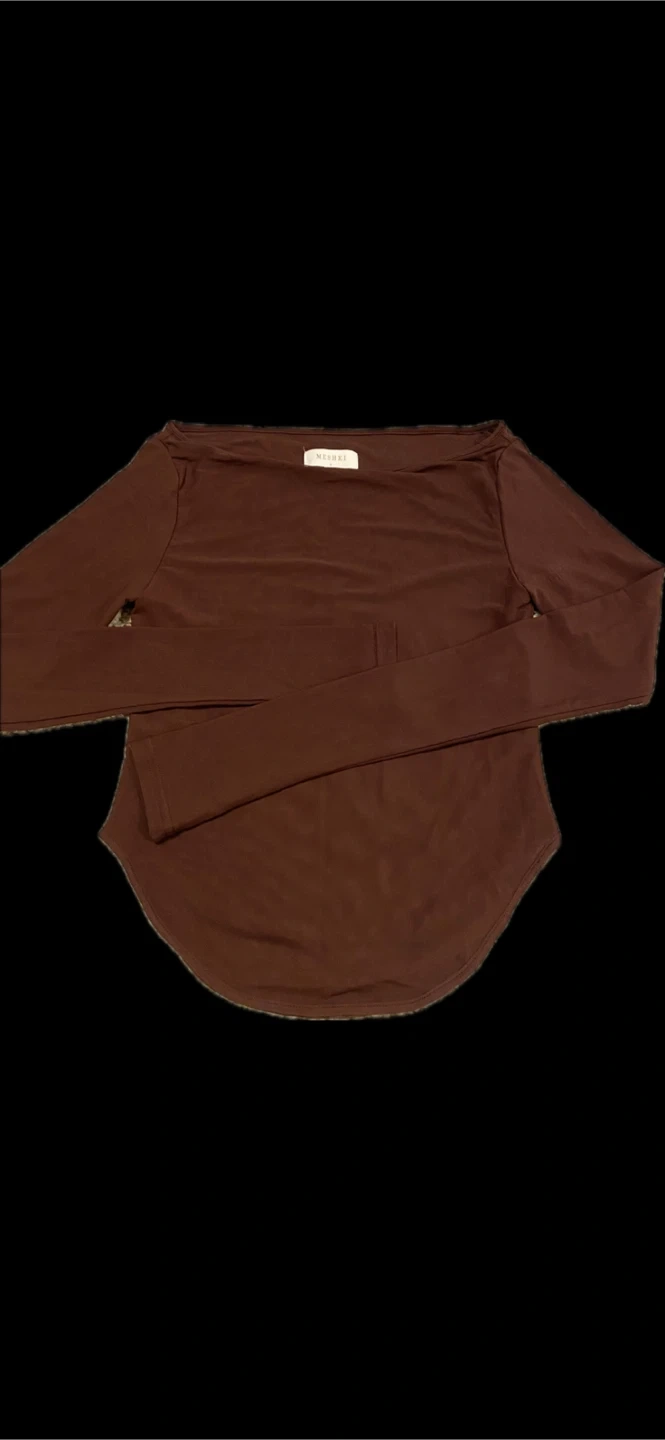 Meshki long sleeve top in a rich brown colour. It's made of a stretchy material that fits comfortably. This top offers a flattering boat neckline.