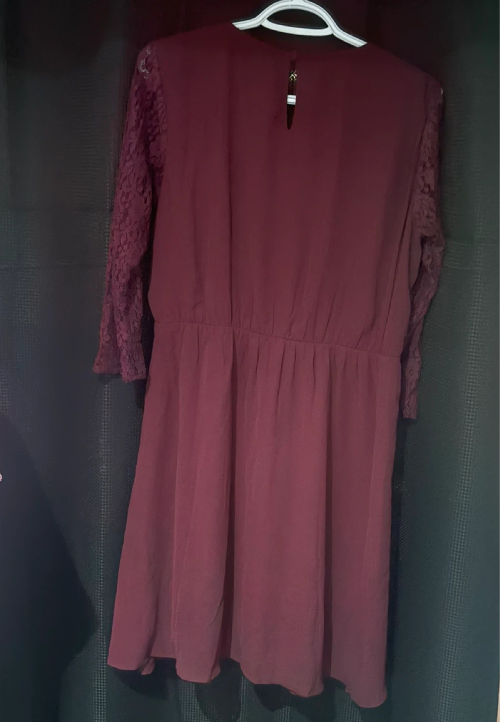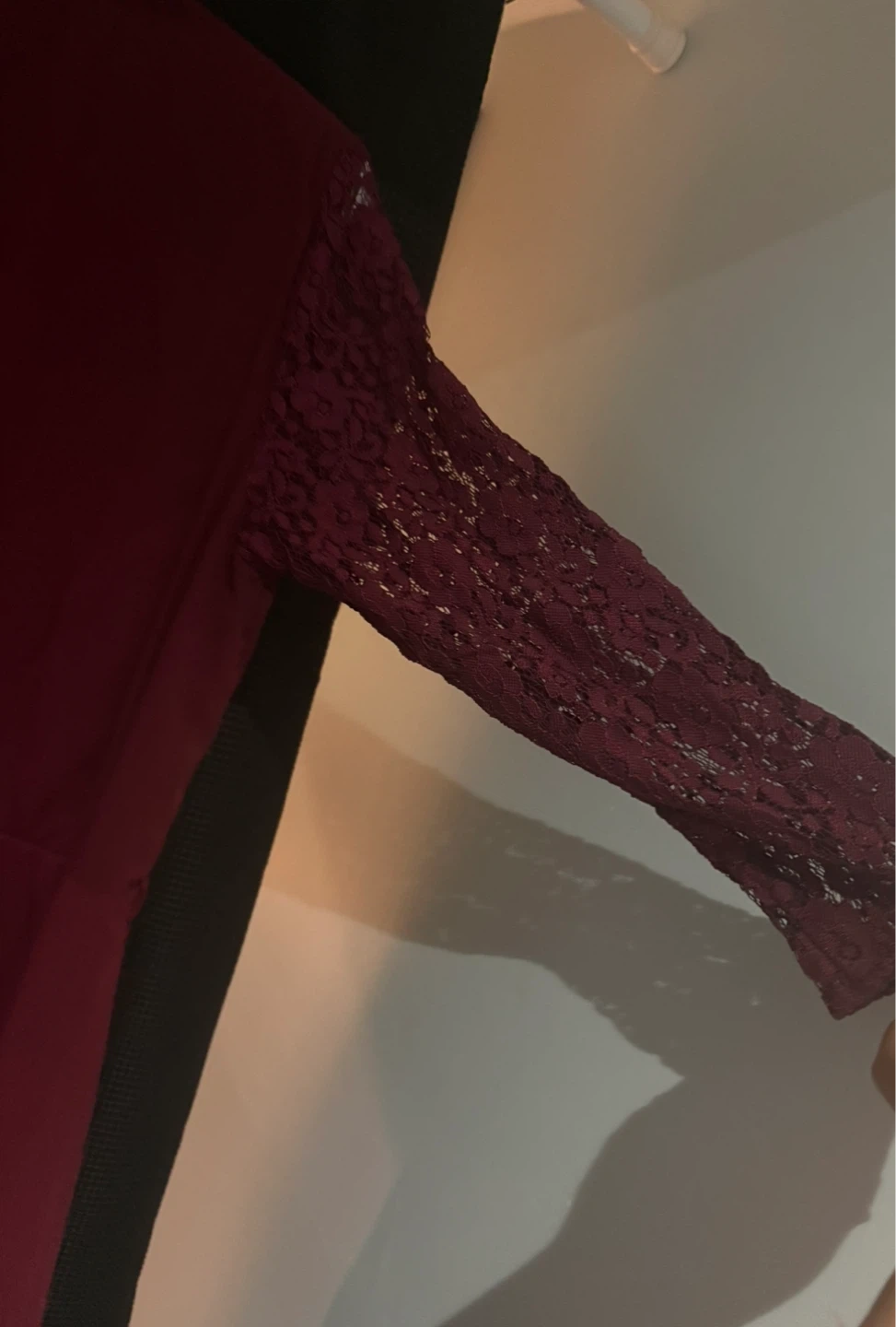 This maroon dress features elegant lace sleeves and a cinched waist for a flattering fit. It's made of a comfortable, flowing fabric. This dress is perfect for a night out or a special occasion!