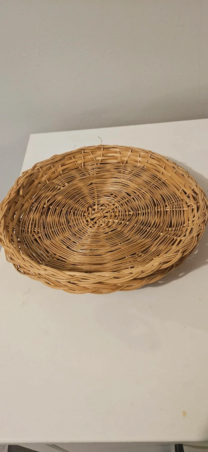 Two round woven trays are up for grabs. These baskets are made from a natural wicker material and are great for serving snacks or organizing small items. They'd be handy for a picnic or to add a rustic touch to your home decor!