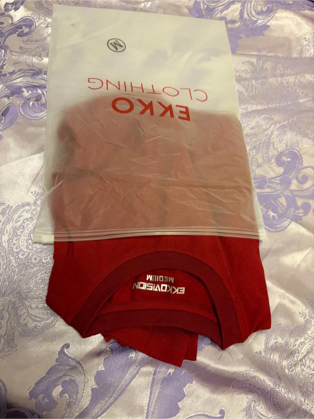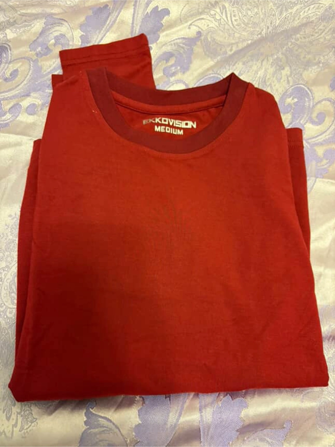 A red t-shirt. Appears to be new, still in its original packaging. Perfect for everyday wear, allowing for ease and comfort.