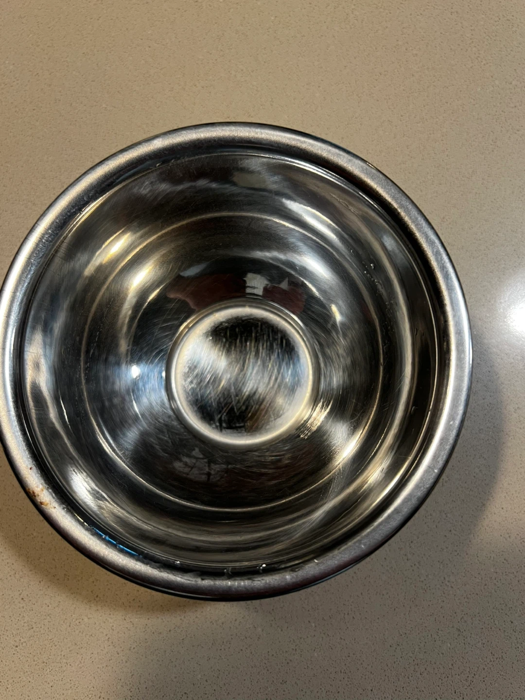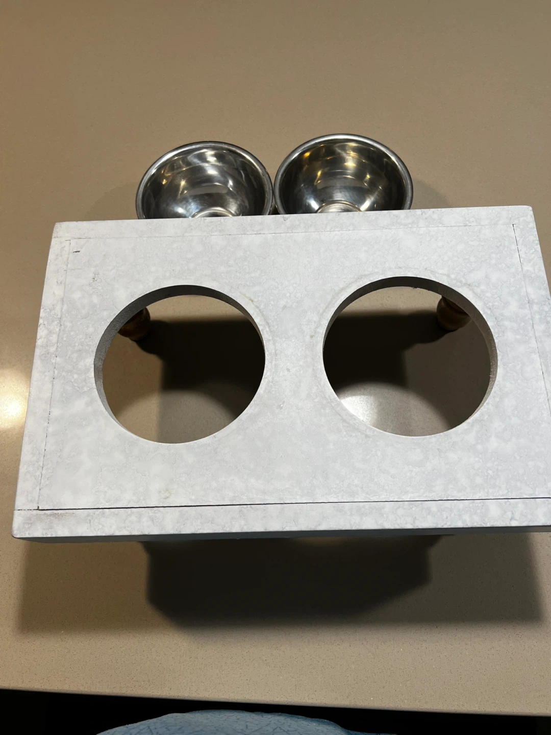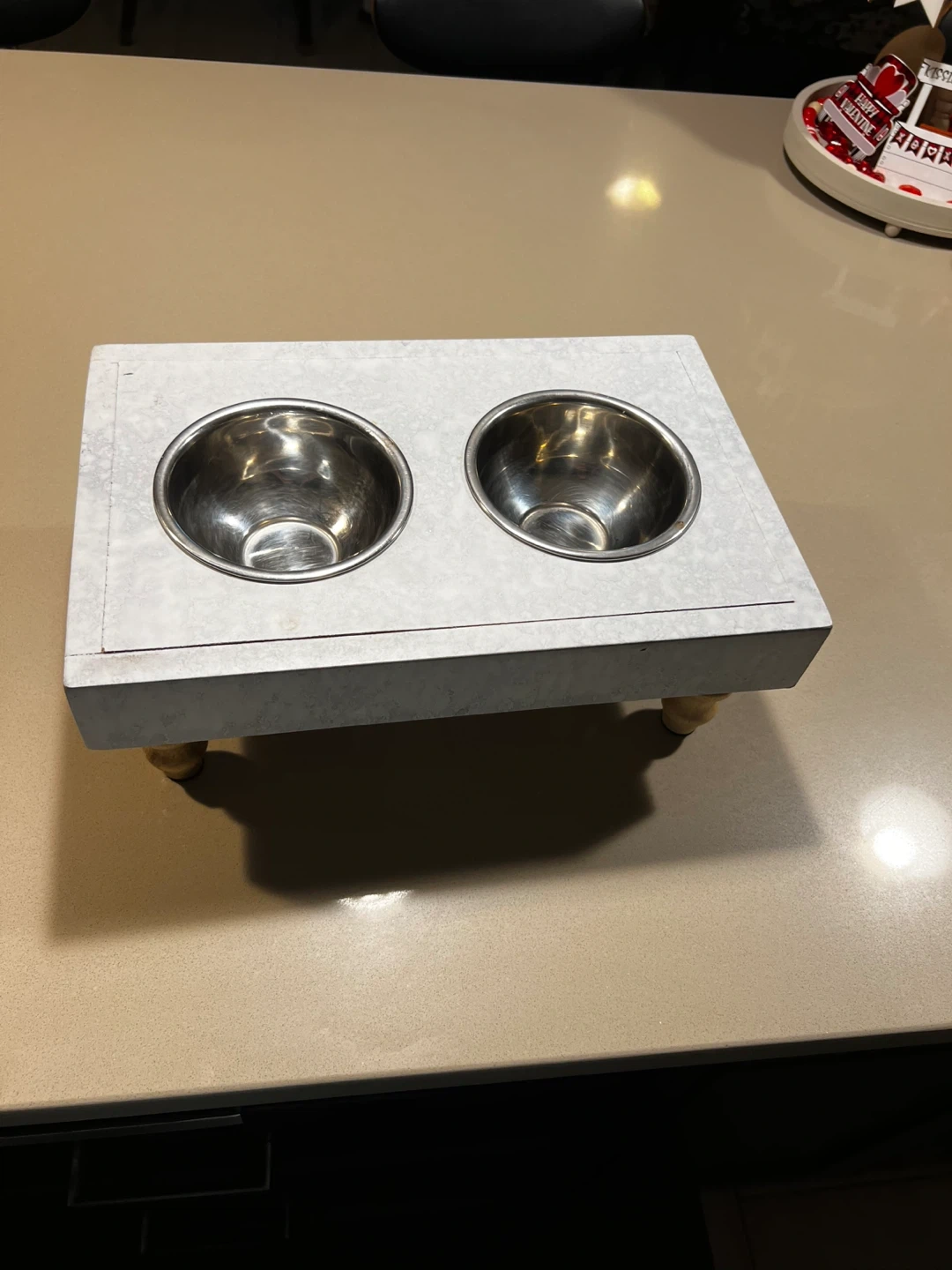 This elevated feeder holds two stainless steel bowls, perfect for dogs or cats. The stand is made of a durable grey material and has small wooden legs. Easy to clean and keeps food and water accessible. 13 inches from the sides and 8 3/8 inches width