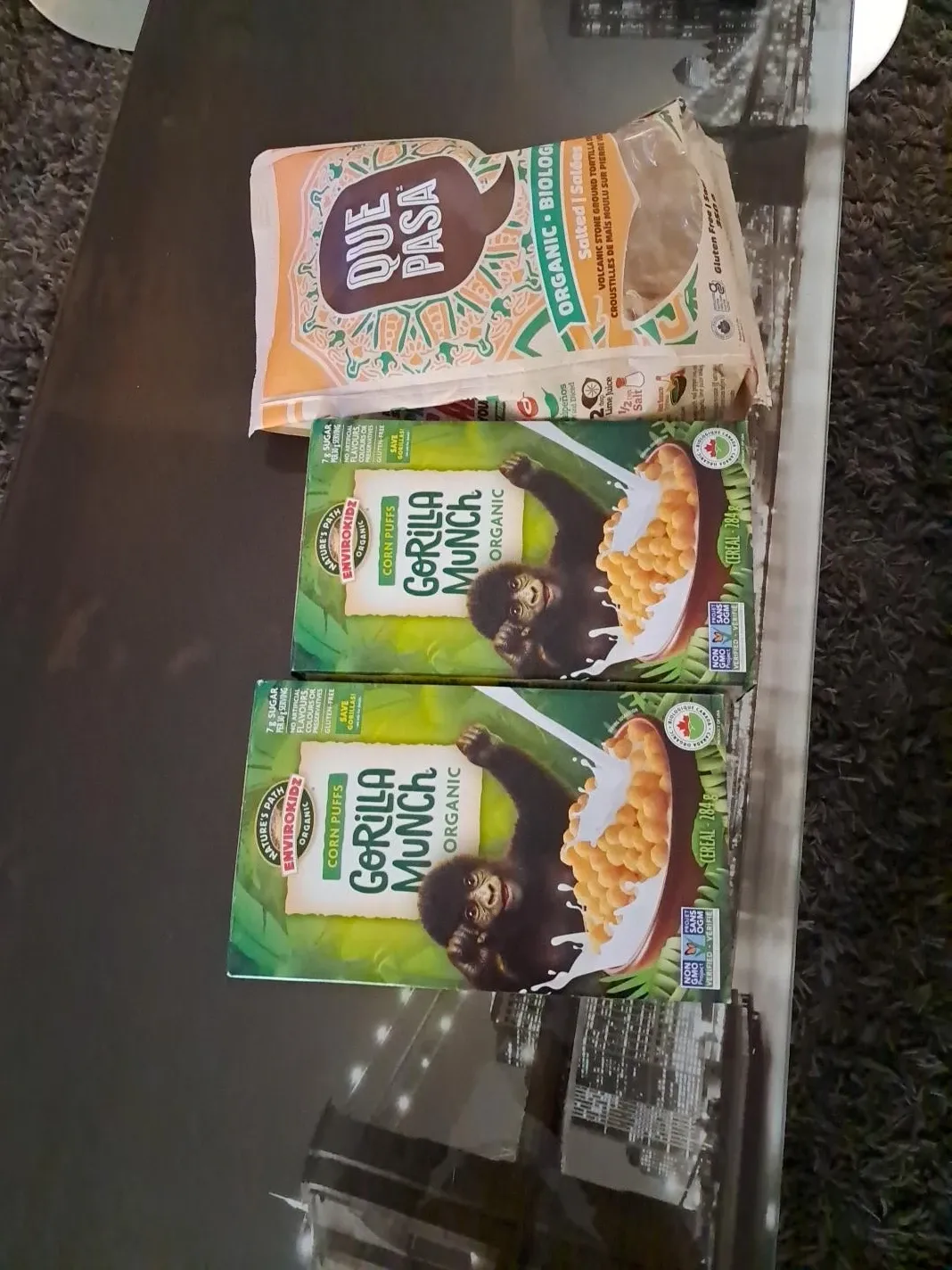 Two boxes of Nature's Path EnviroKidz Gorilla Munch organic corn puffs cereal are available. It's gluten-free with no artificial flavours or colours. Each box contains 284g of cereal.all are good not expired dec 2026