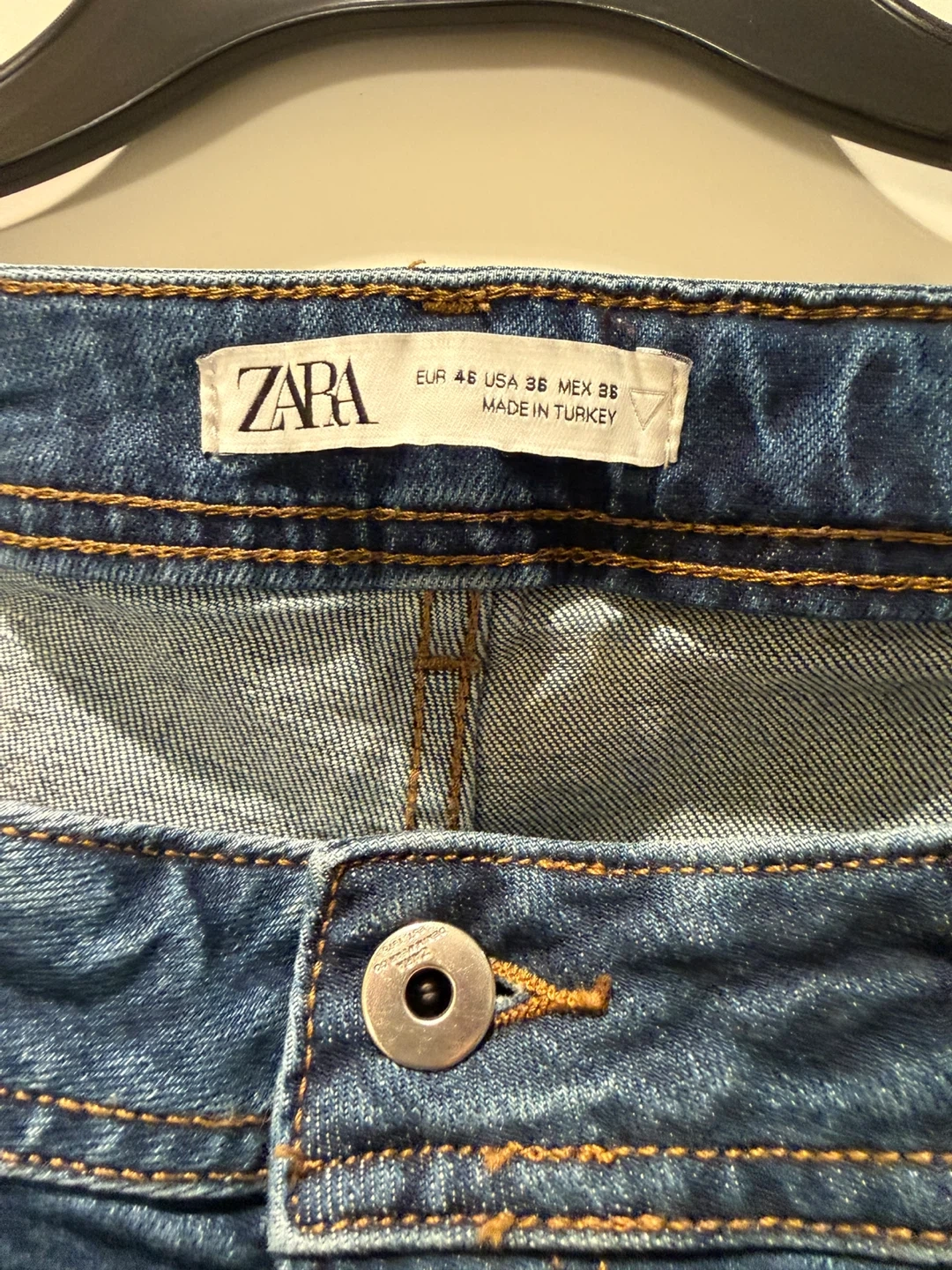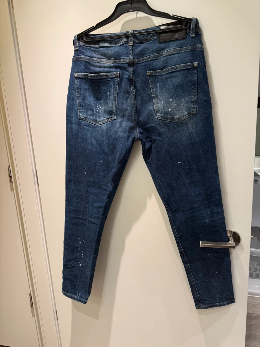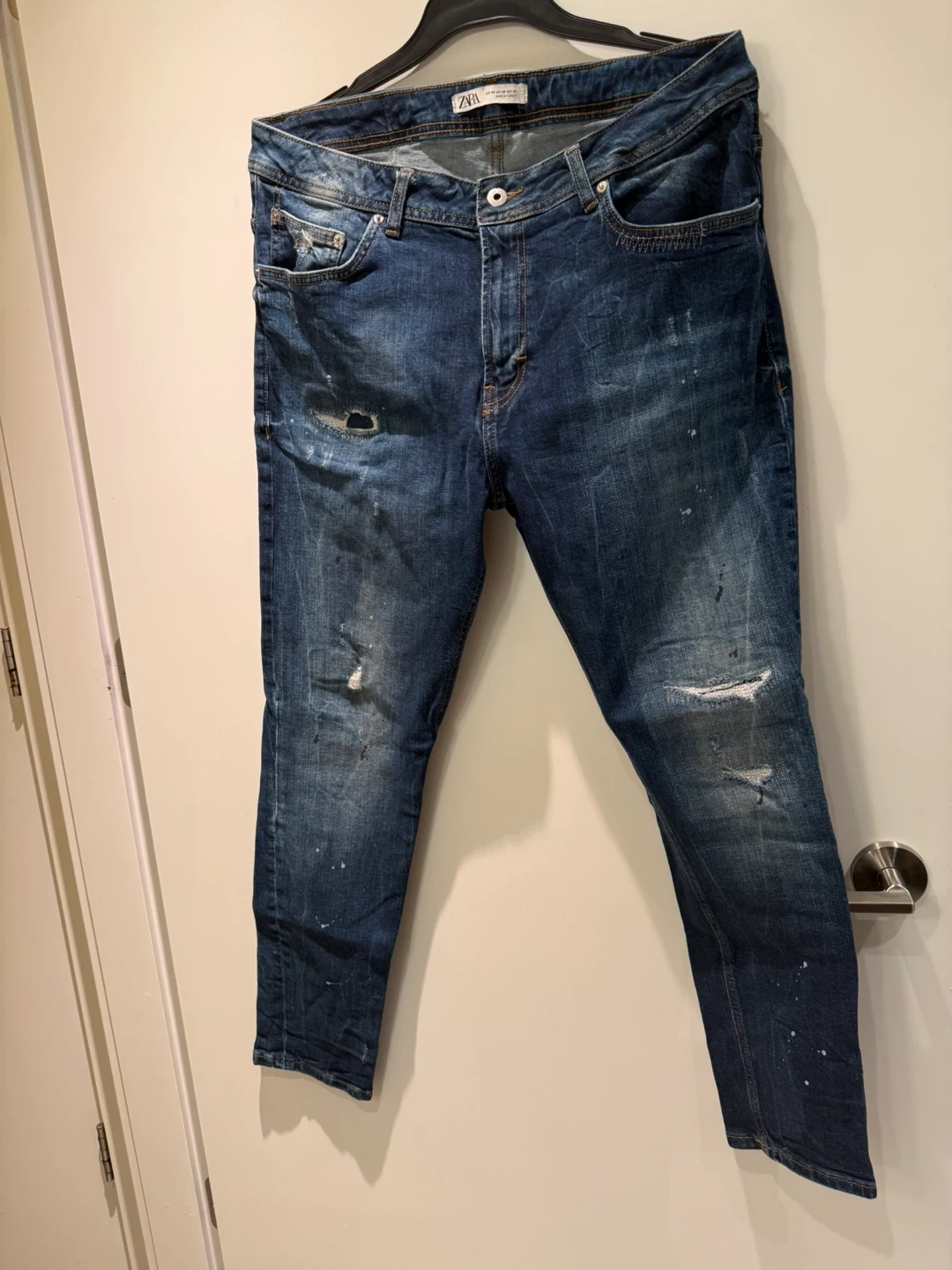 ZARA men's blue jeans in a distressed wash with paint splatters. These jeans are size EUR 46, US 36, and MEX 36, made in Turkey. They feature a classic five-pocket design and a button fly closure. Perfect for a casual everyday look!