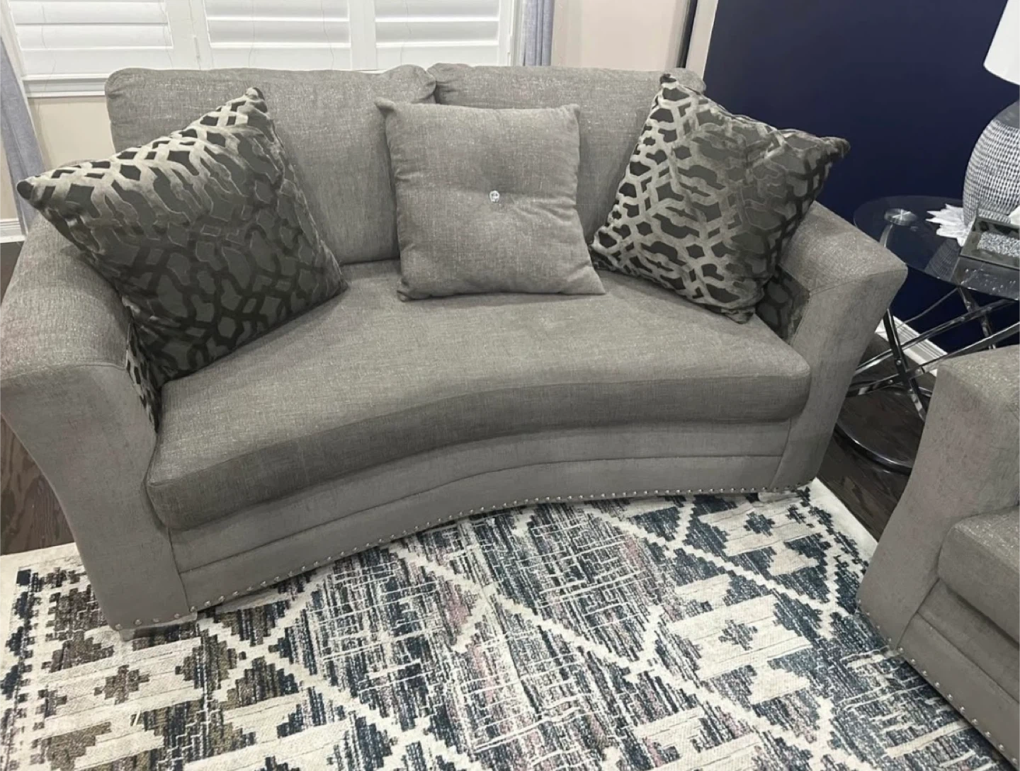 A comfortable grey fabric sofa set with a gentle curve, perfect for any living room. It comes with decorative accent pillows. Just few year old in mint condition. Pet free home. Move out sale