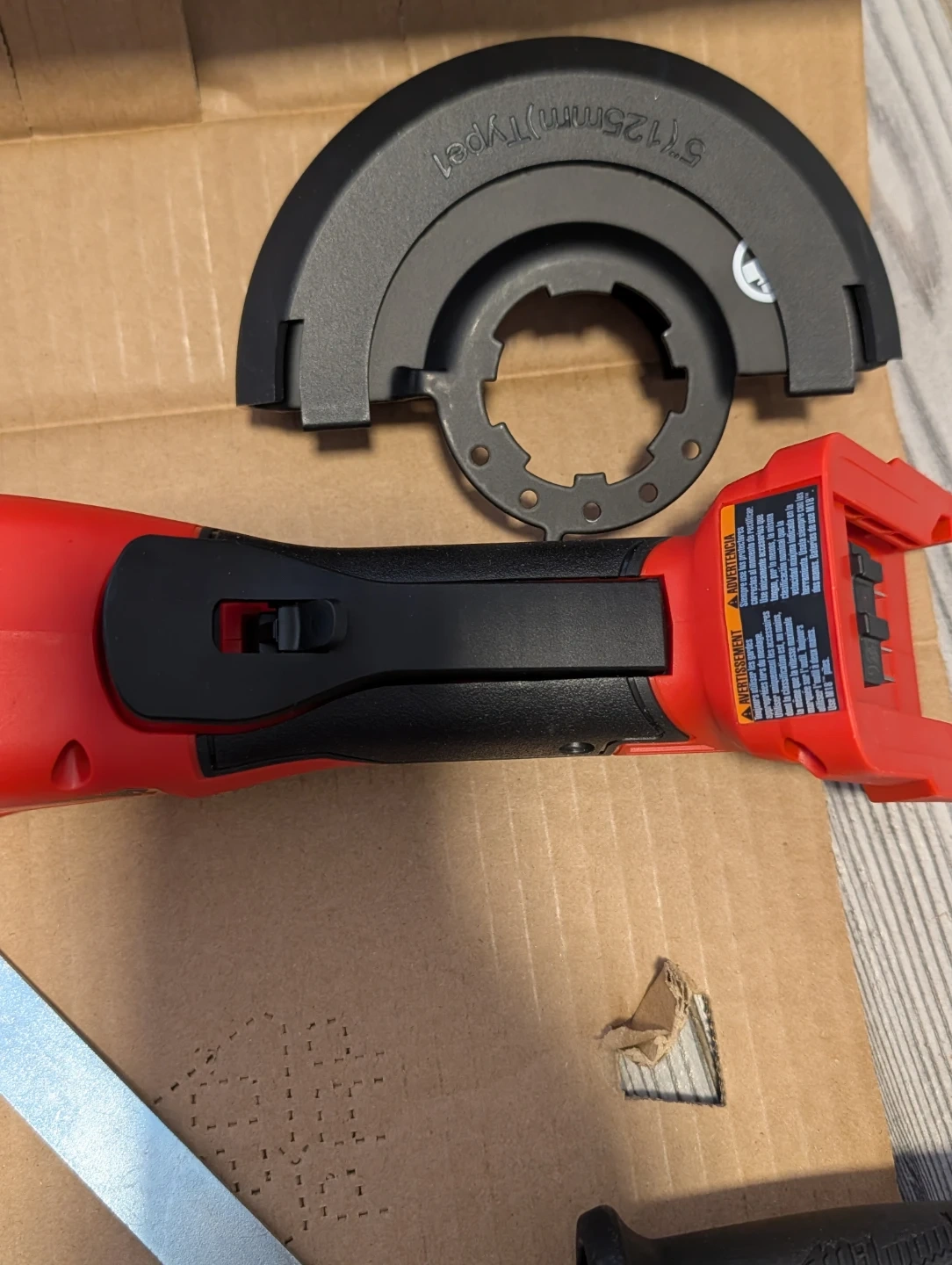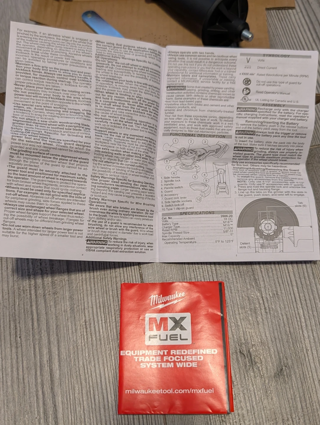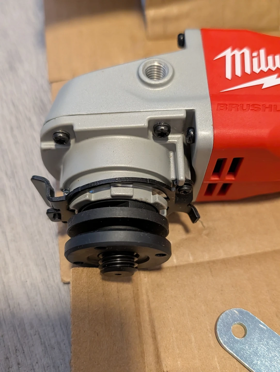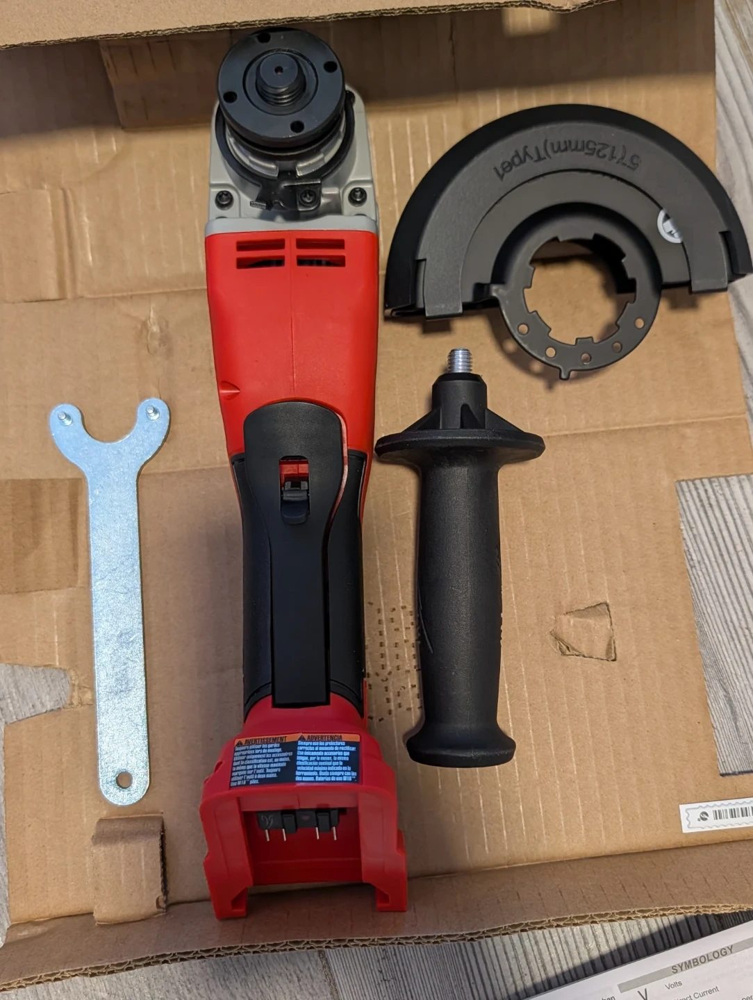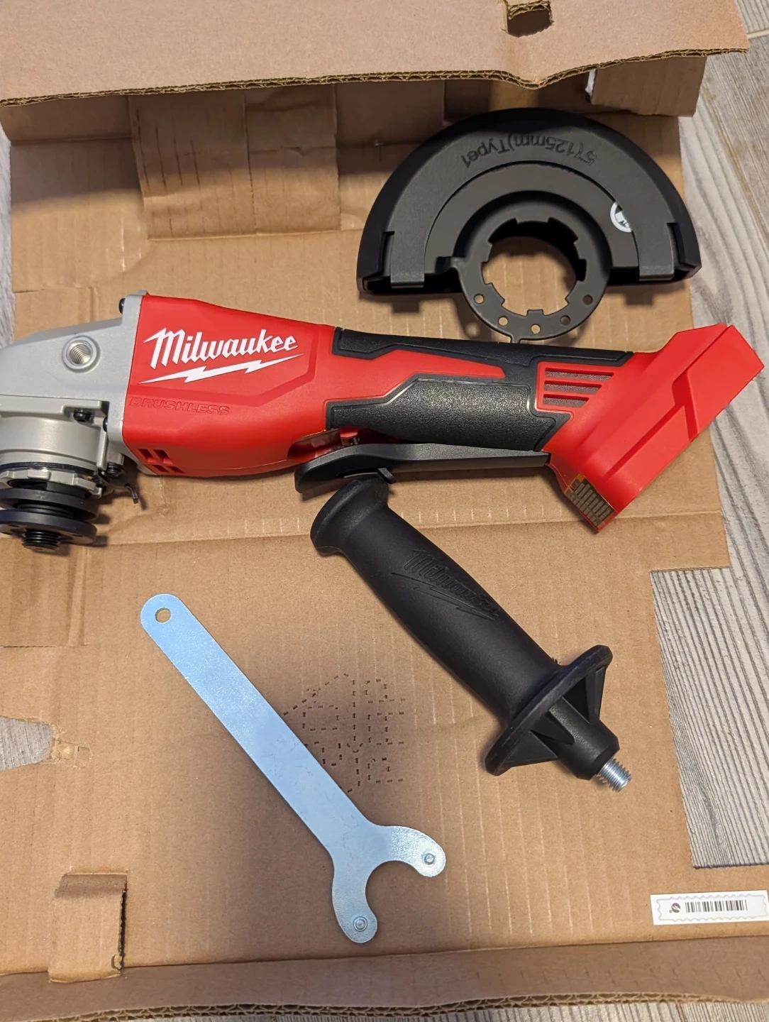 Milwaukee cordless angle grinder. Brushless motor. Includes grinding guard, handle, and wrench. 4.5-5" disks (125mm) capacity.