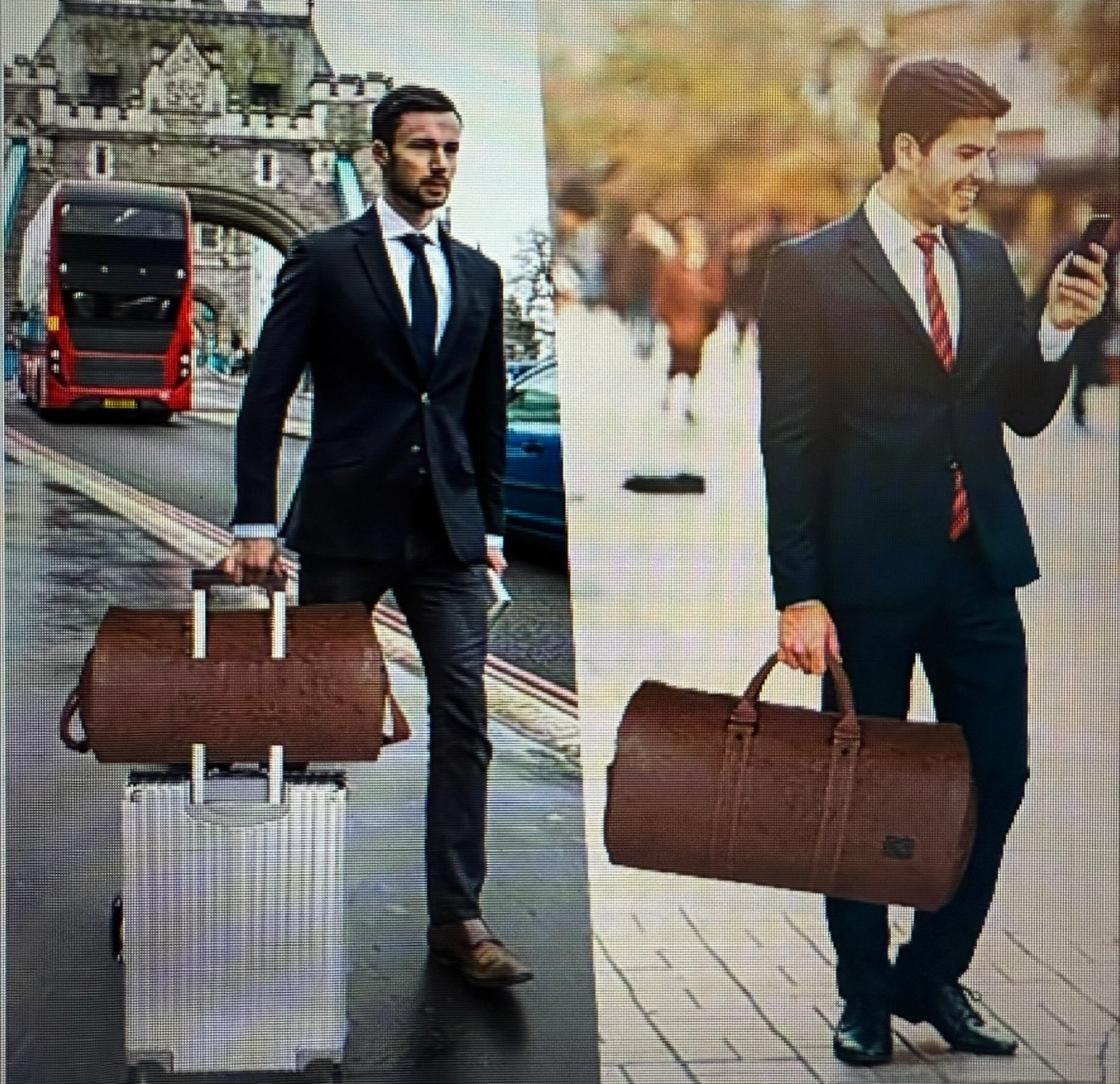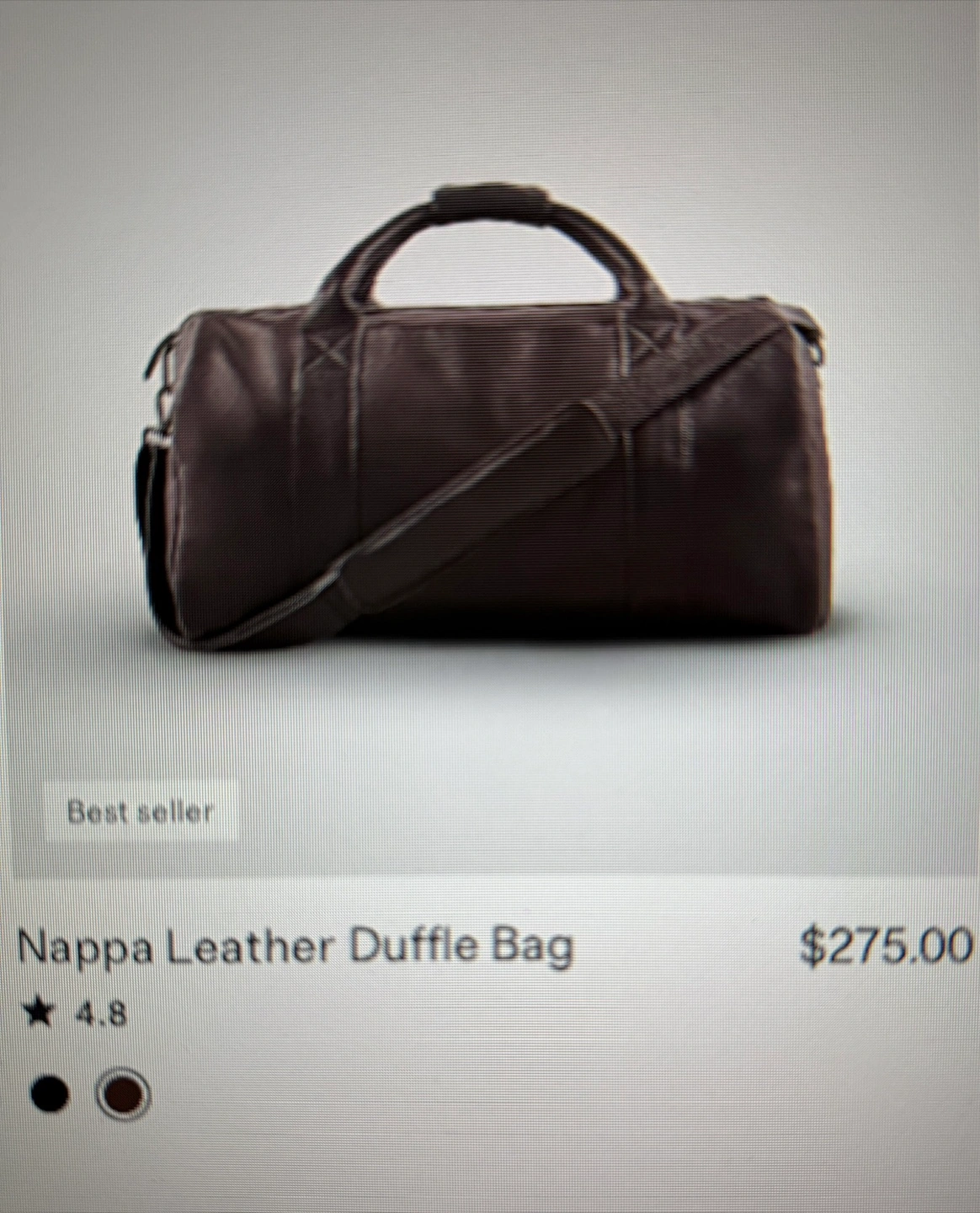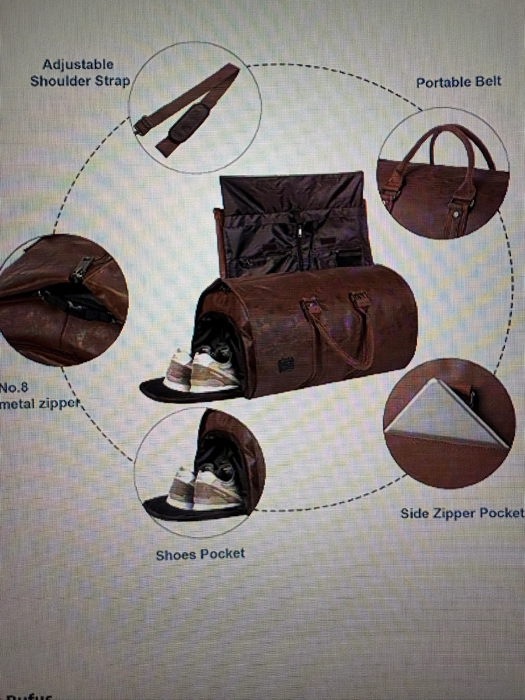 Nappa faux leather duffle bag. It features an adjustable shoulder strap, interior pockets, and a side zipper pocket; also has a dedicated shoes pocket.