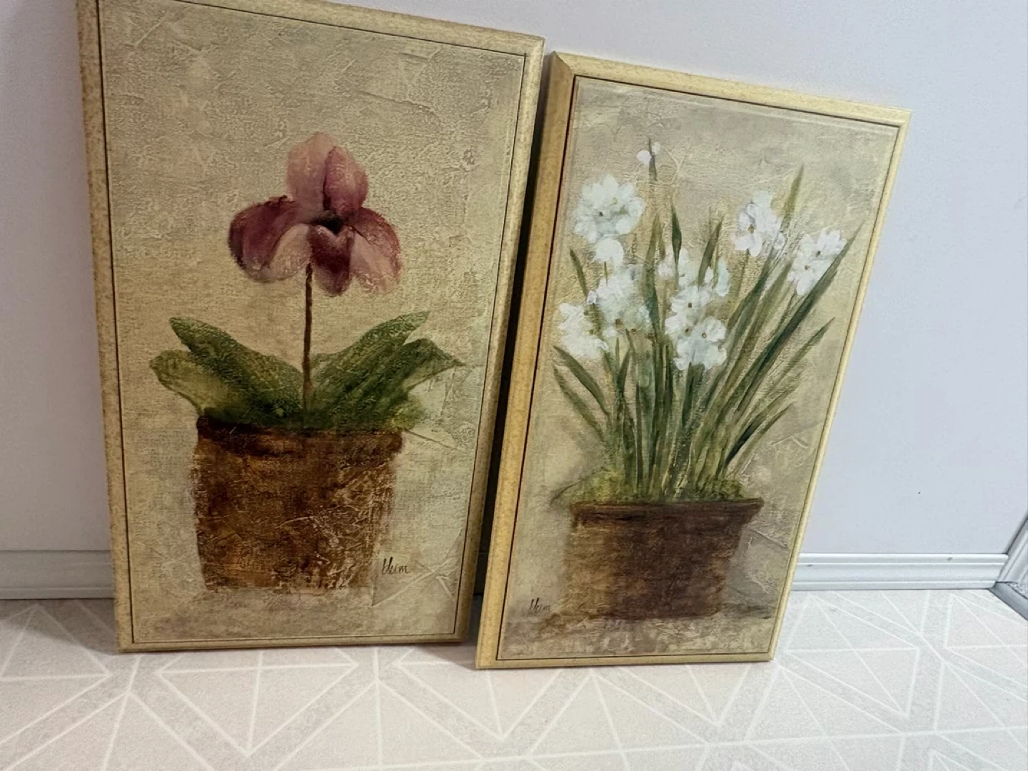 This set features two framed art prints of potted flowers. One print displays a single orchid, while the other shows a cluster of white blooms. They're framed in a light gold-toned finish. Pick up cash only