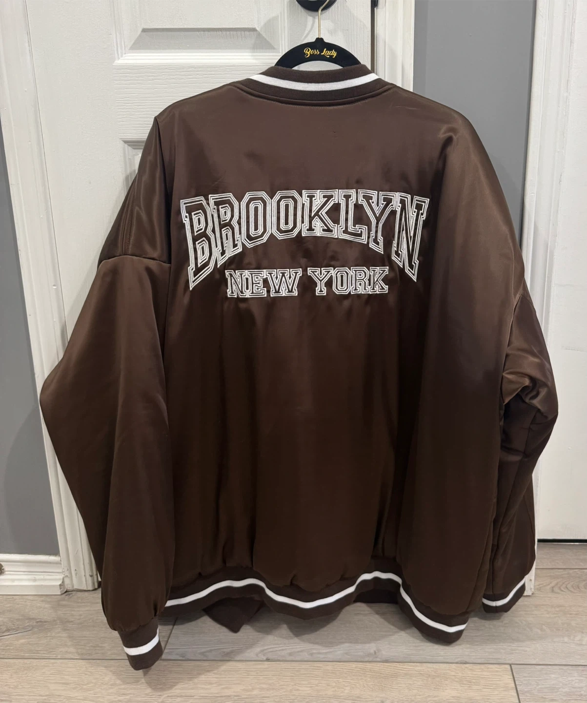 This brown bomber jacket features "Brooklyn New York" embroidered on the back and "New York" on the front chest. It has a satin-like finish with striped ribbed cuffs, collar, and hem.