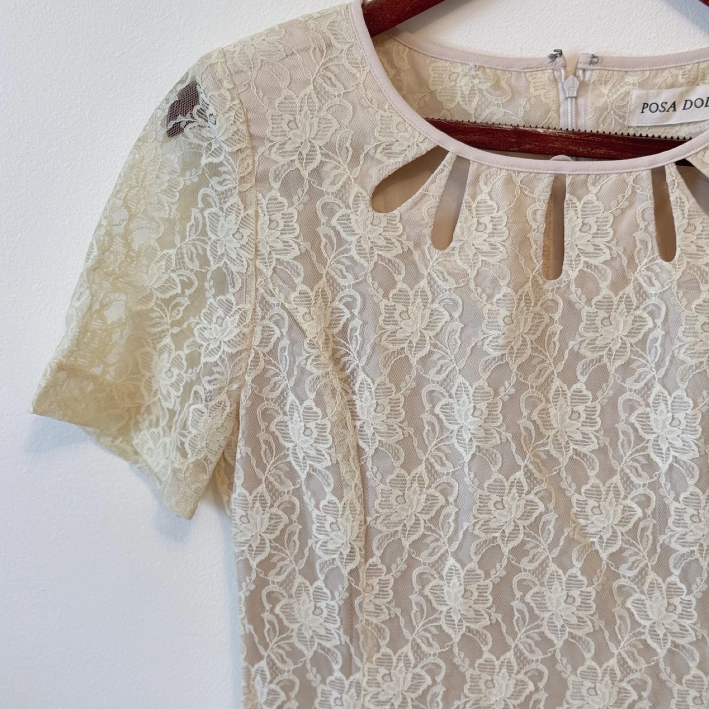 A romantic vintage ivory lace dress by Posa Doll, featuring an elegant floral lace overlay with a beautifully fitted waist and flared skirt. The delicate cutout neckline detail adds a sophisticated touch, making it perfect for both formal and vintage-inspired looks. The fully lined interior ensures comfort while maintaining the graceful, classic silhouette.