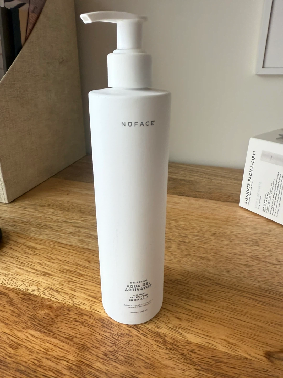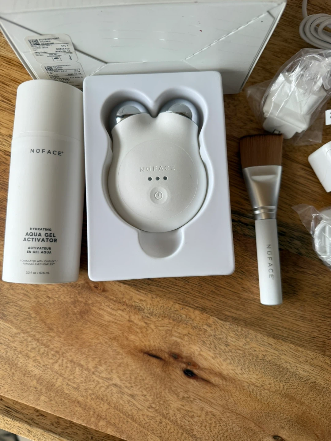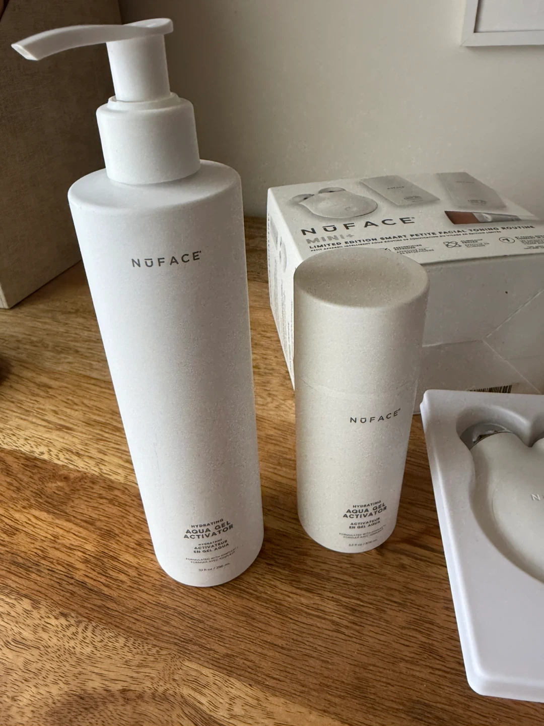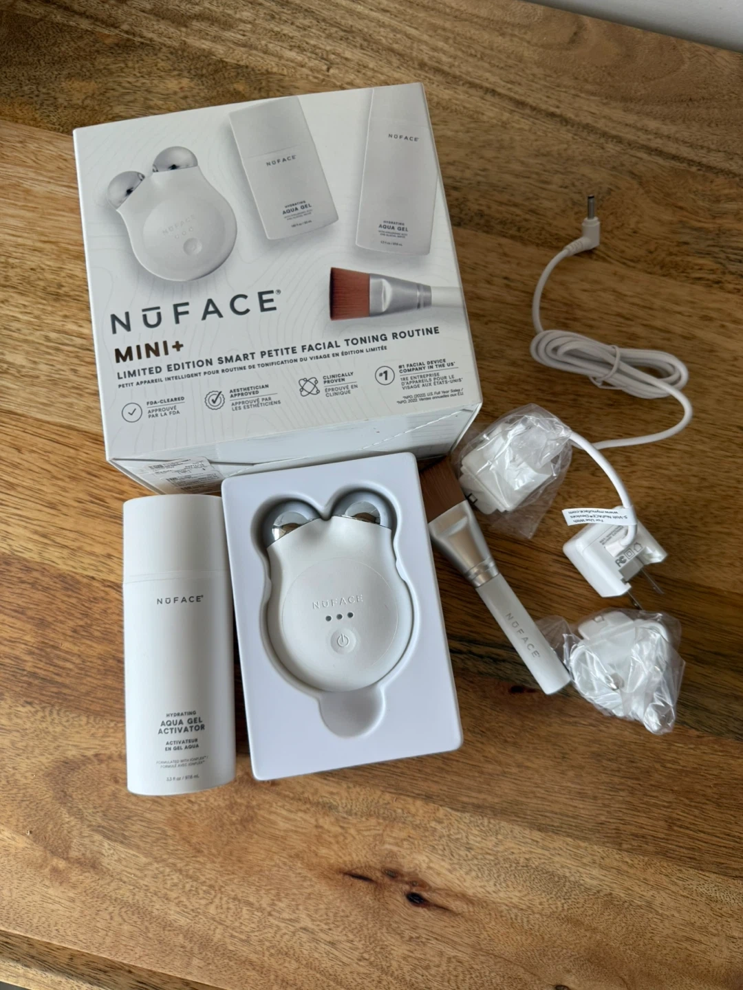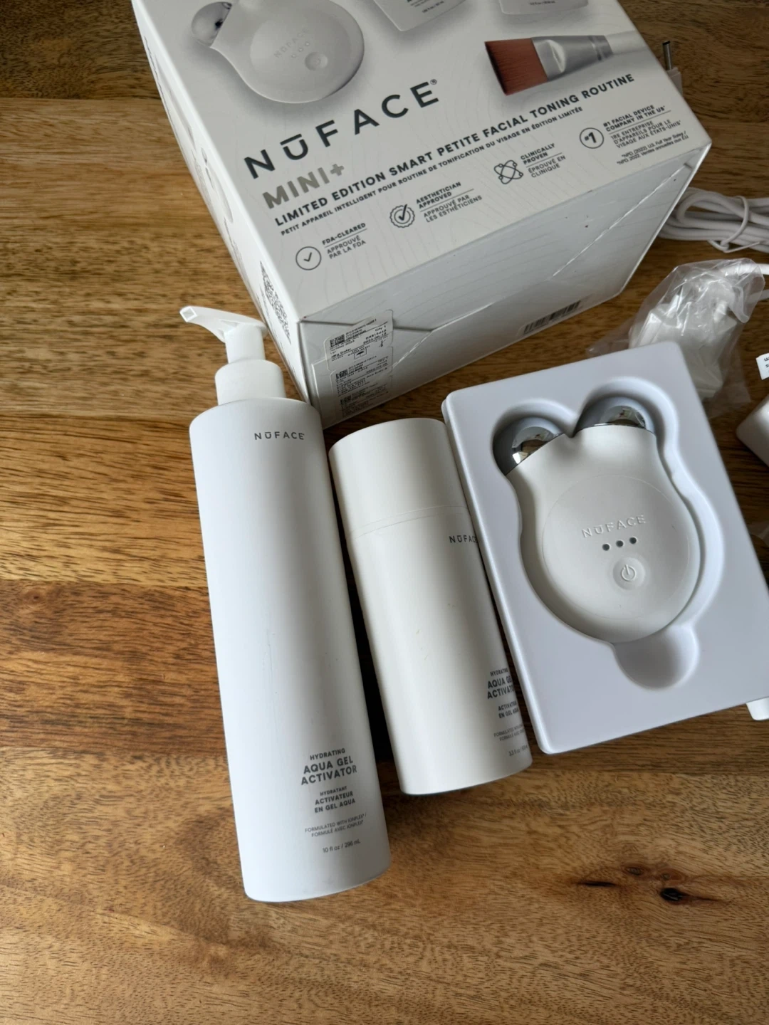 This is the NuFace Mini+ Limited Edition Smart Petite Facial Toning Routine. It comes with the device, a large bottle of Hydrating Aqua Gel Activator (10 fl oz / 300 mL), a smaller bottle of Aqua Gel Activator (3.5 fl oz / 91.6 mL), a brush, and charging accessories. This set is designed for at-home facial toning.