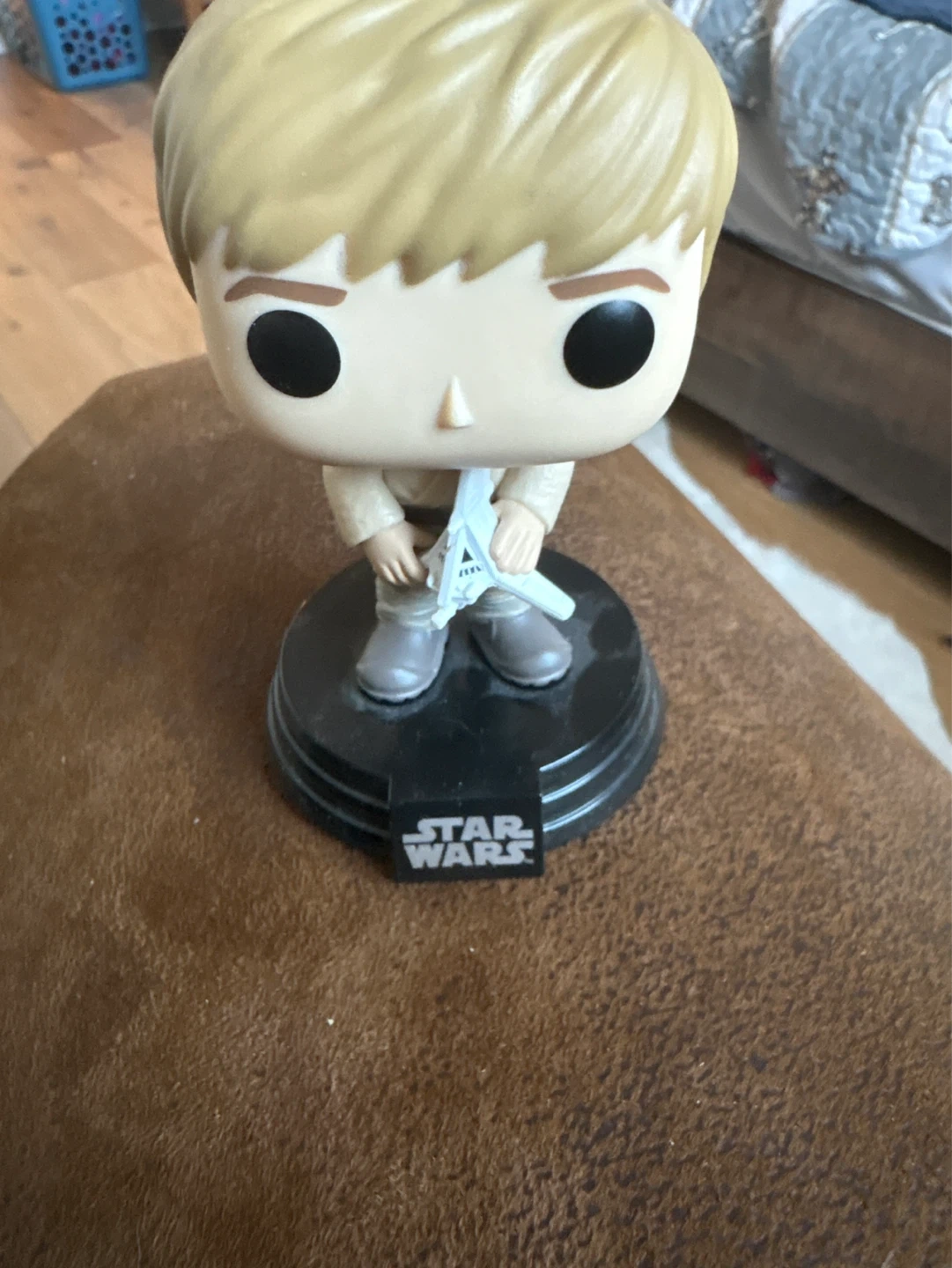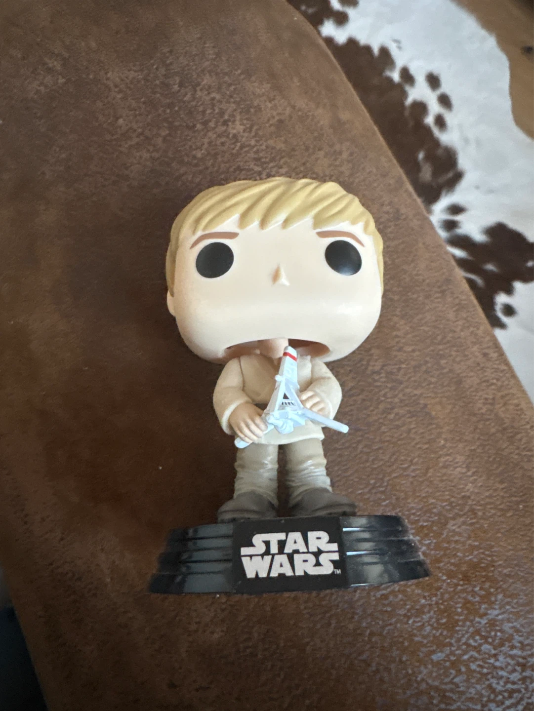 This is a Funko Pop vinyl figure of Luke Skywalker from Star Wars. It's from 2023 and made in China. The figure is standing with a lightsaber. A great collectible for any Star Wars fan!