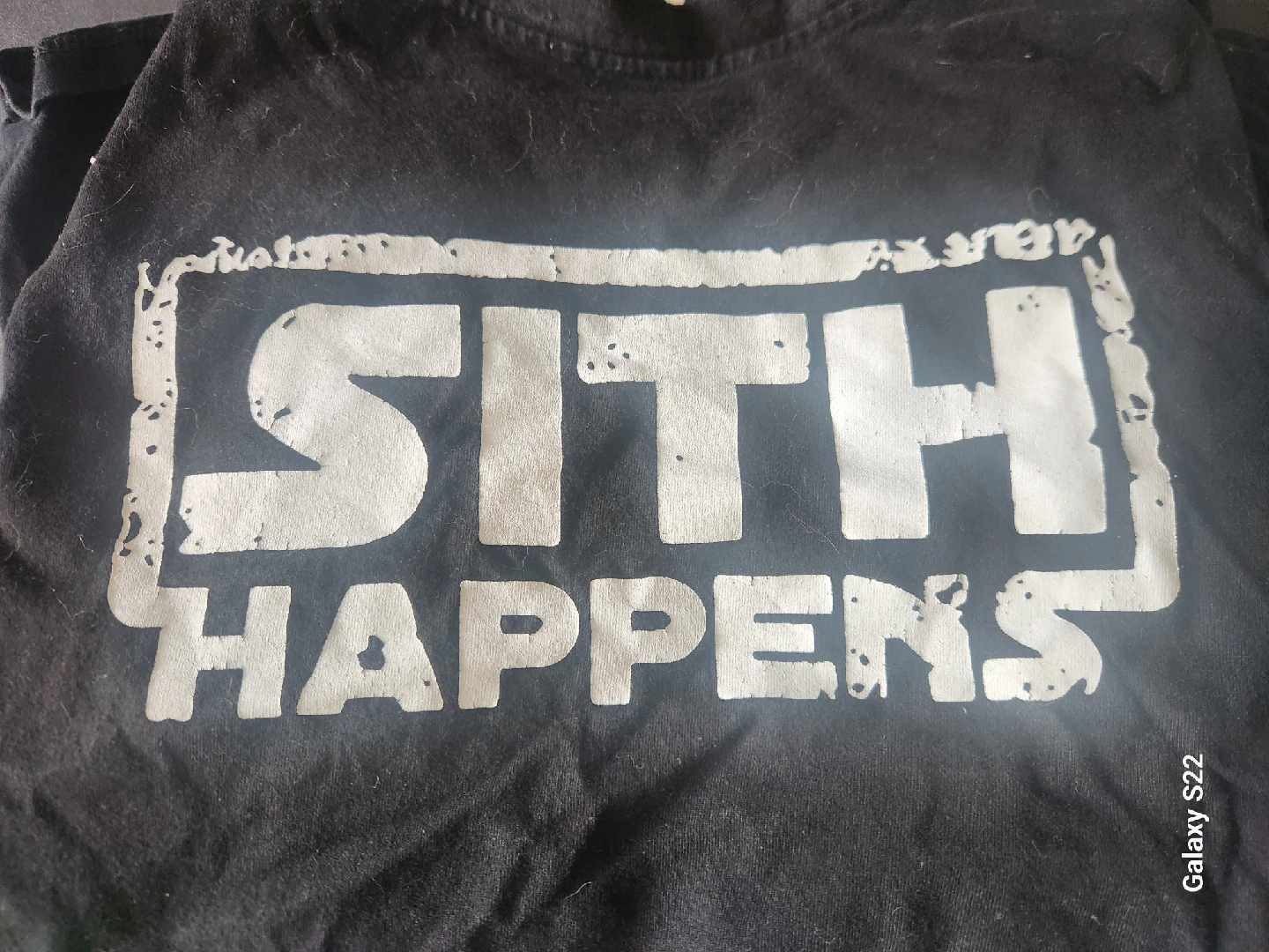 Selling a black t-shirt with the phrase "Sith Happens" printed on it. It's in good condition and ready for a new home!