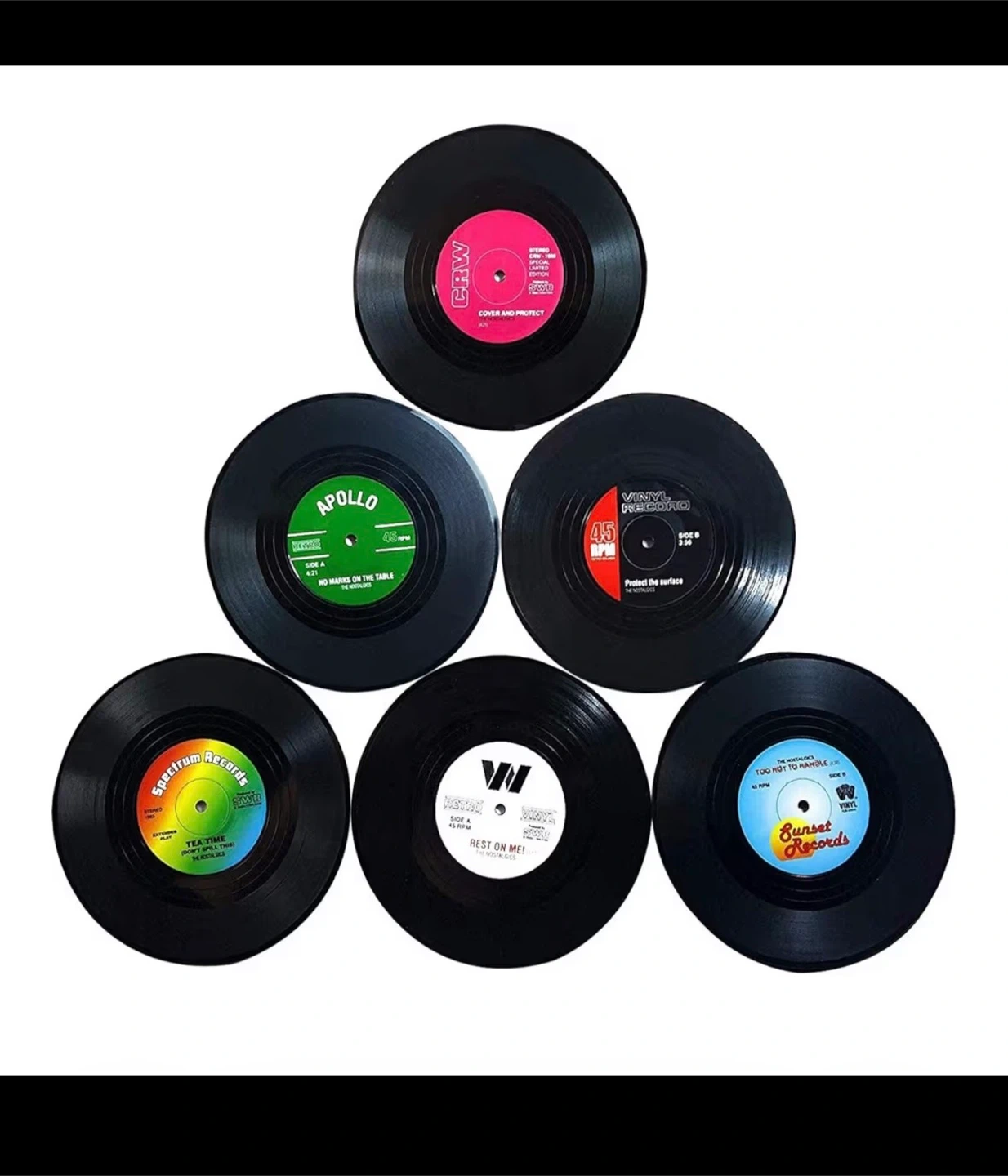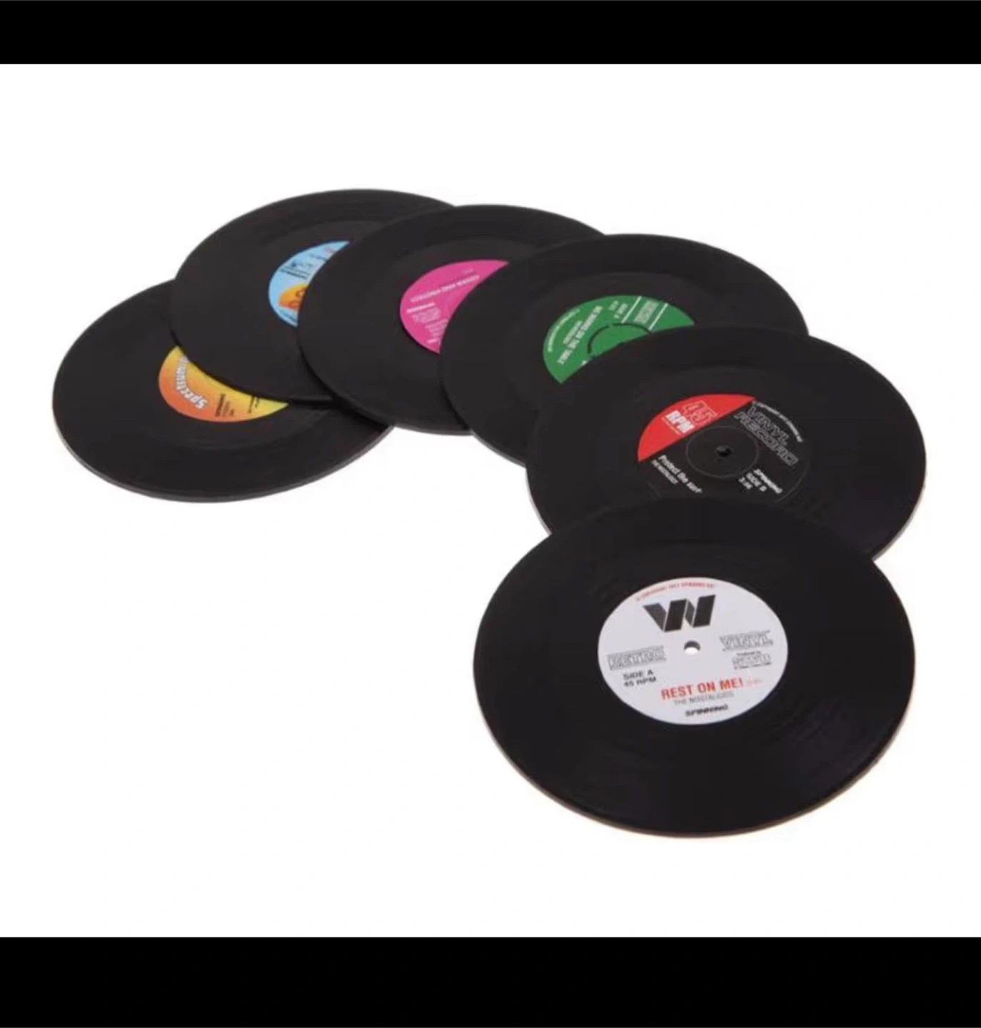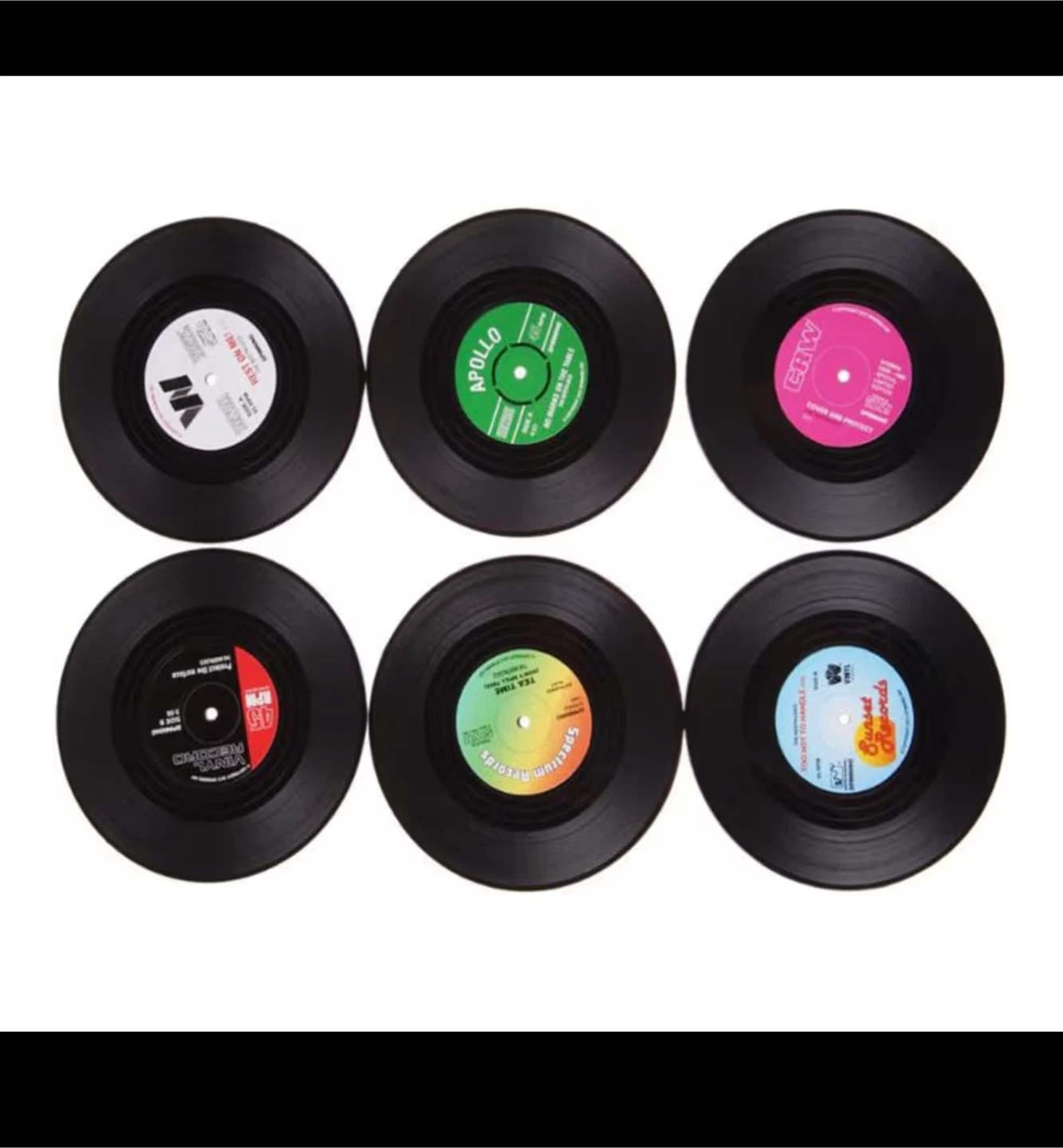 Brand new in box mini vinyl record coasters. These coasters are perfect for your drink, beer, tea, whiskey, vodka or soda. Diameter of 10.5 cm and thickness of 0.2 cm. The non-slip design ensures that your glasses and mugs do not slide. Ideal gift for music lovers. Set of 6 multi-colored vinyl record coasters.
