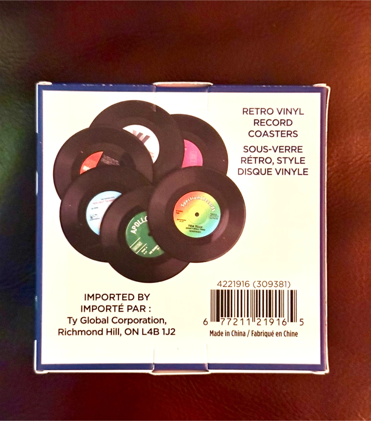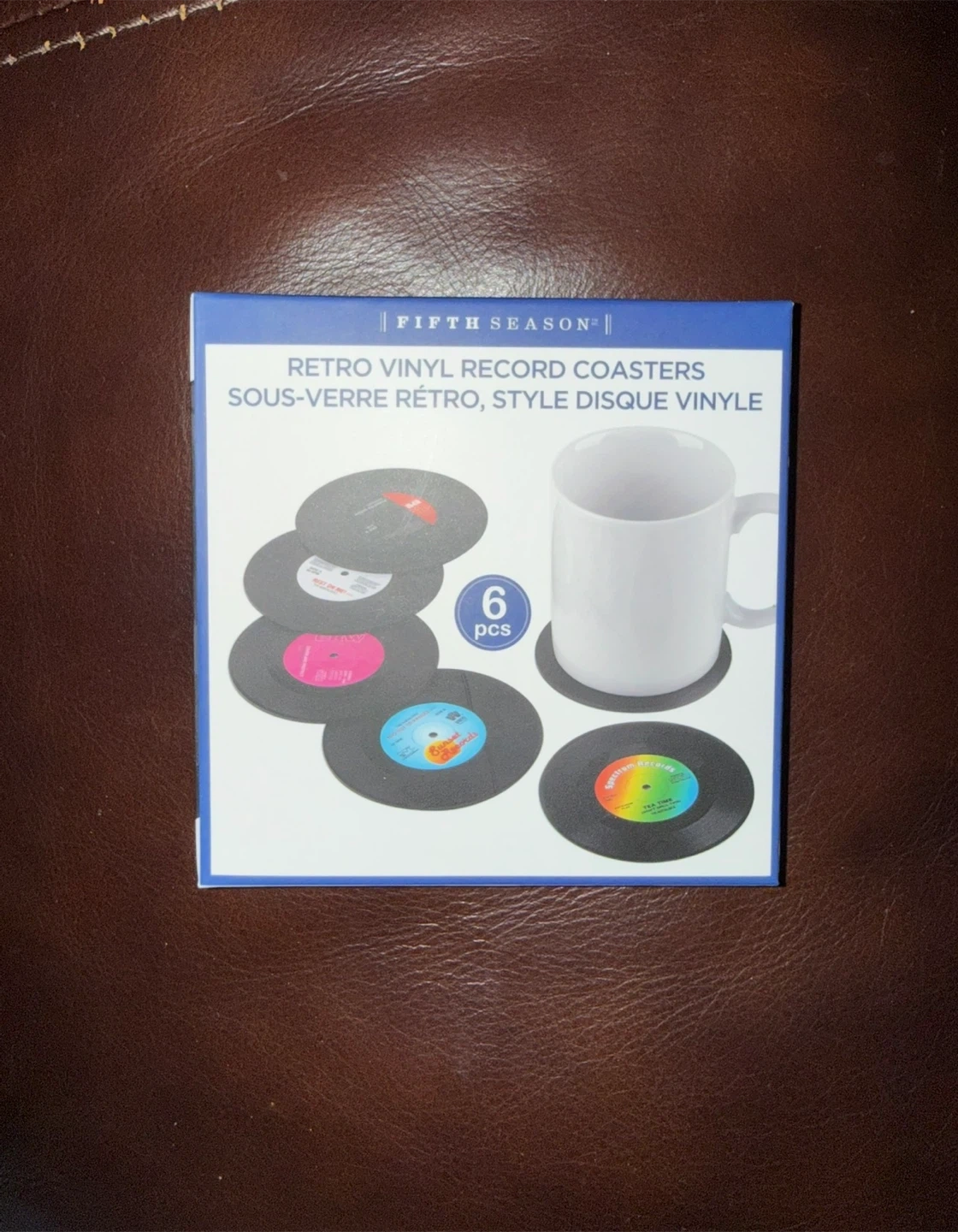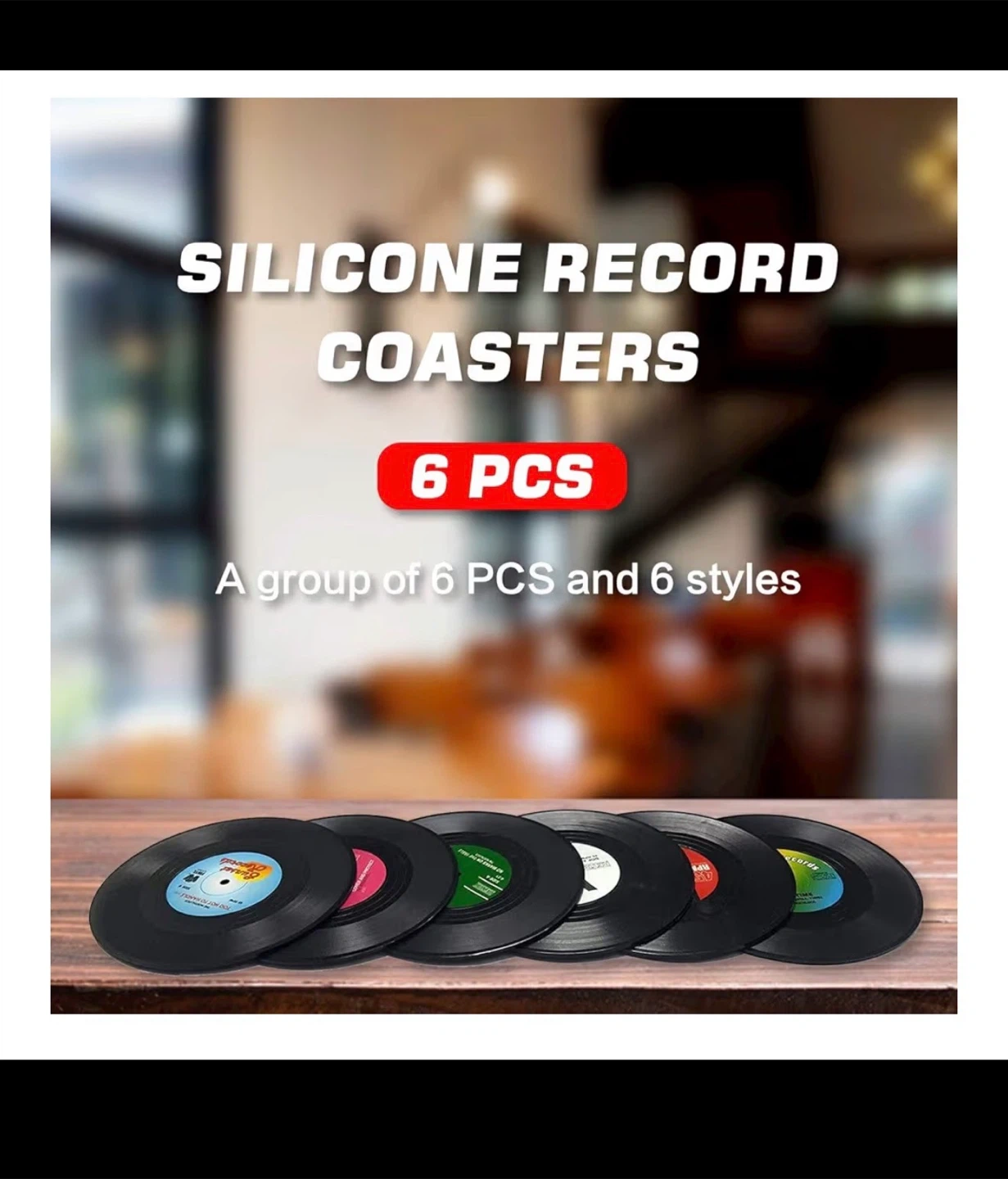 Brand new in box mini vinyl record coasters. These coasters are perfect for your drink, beer, tea, whiskey, vodka or soda. Diameter of 10.5 cm and thickness of 0.2 cm. The non-slip design ensures that your glasses and mugs do not slide. Ideal gift for music lovers. Set of 6 multi-colored vinyl record coasters.