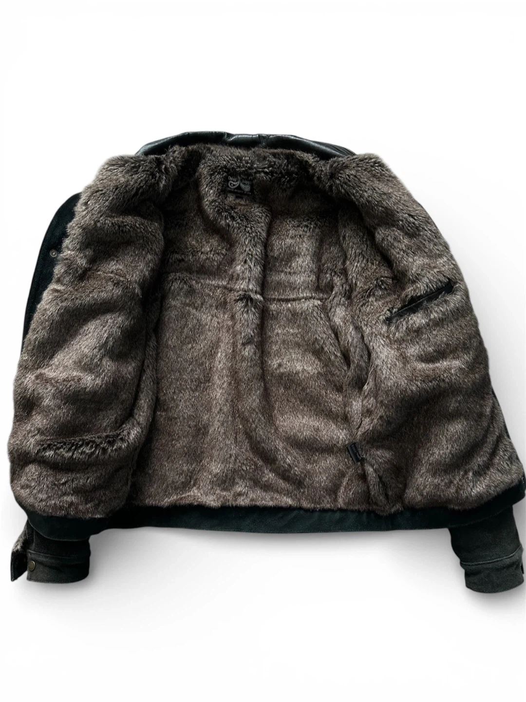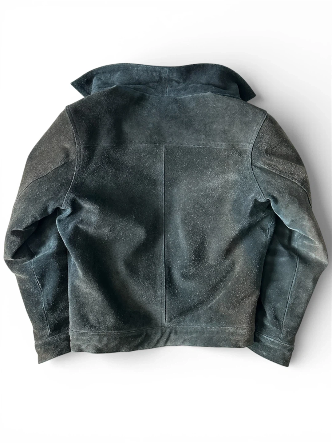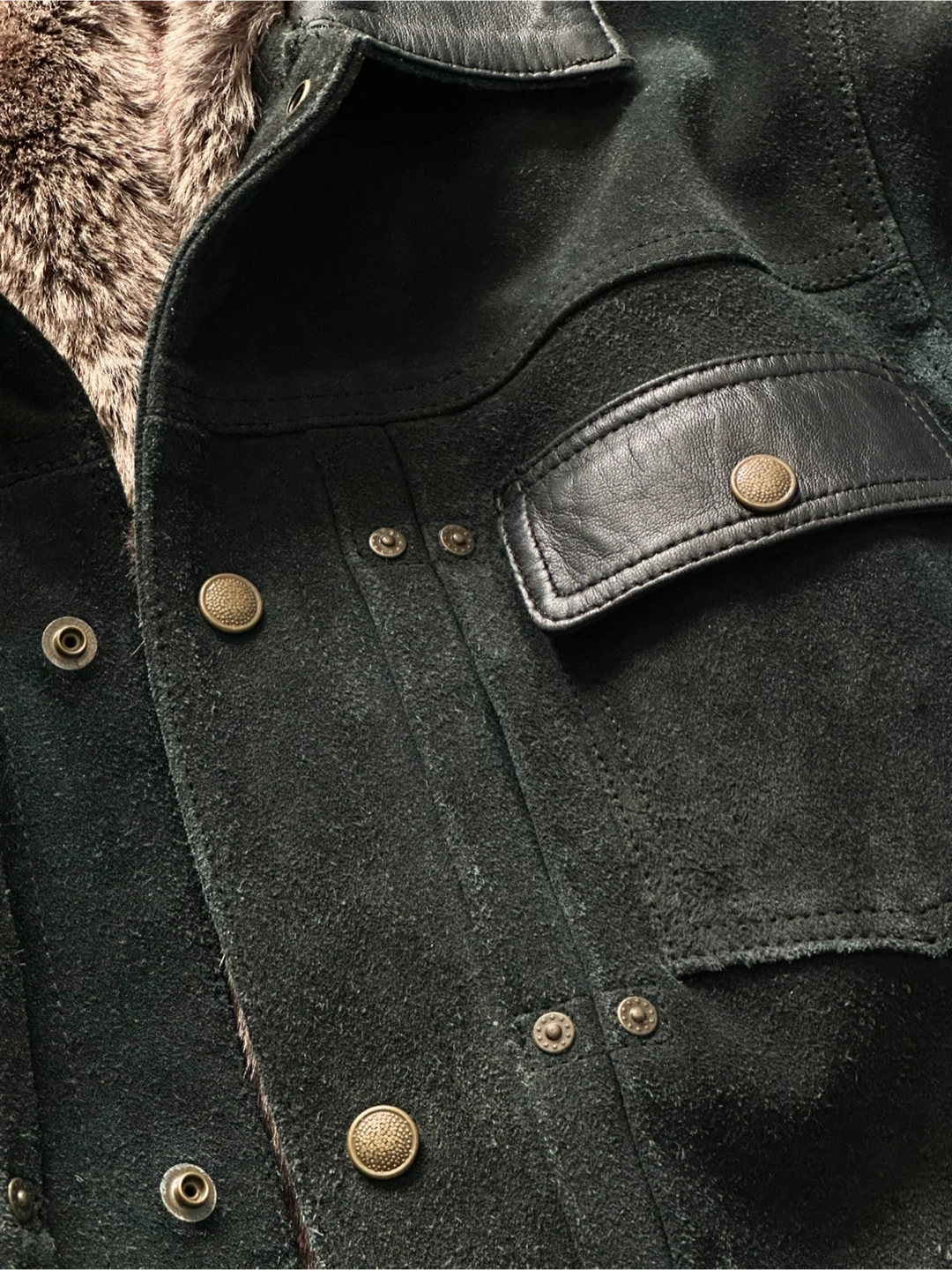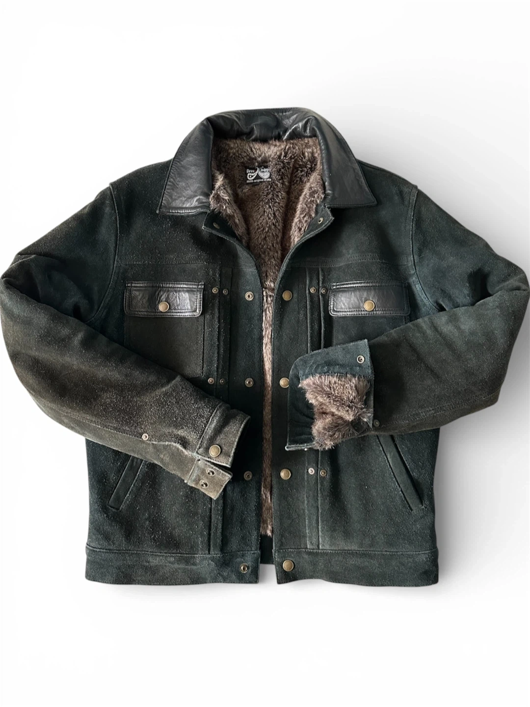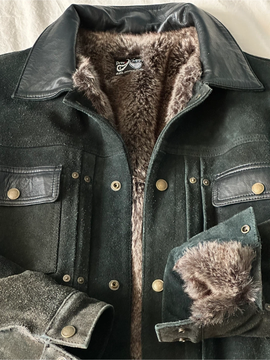 This Dream Denim jacket features a rich green suede exterior with a cozy faux fur lining. It has a classic trucker jacket design with button closures, 2 chest pockets and 2 hand warmer pockets that are also lined for extra warmth. Suede material outer and very dense and warm fur lining. Perfect for winter season. Size small