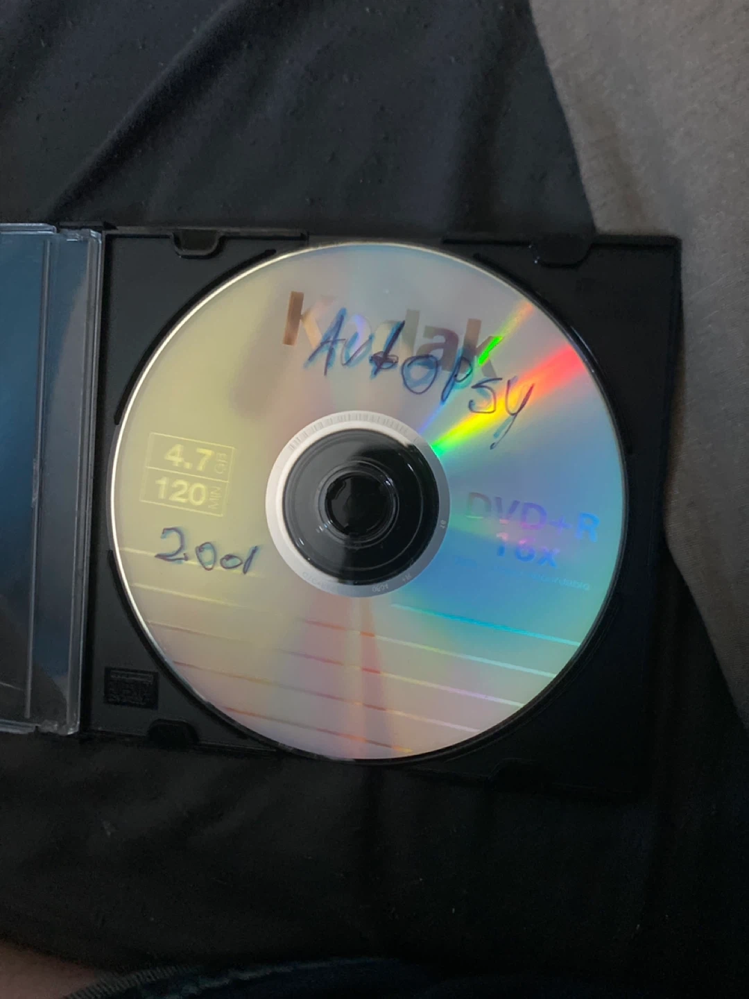 DVD-R disc labelled 'Autopsy'. Includes the year '2001' written on it. This is a blank recordable disc, not a commercial movie.