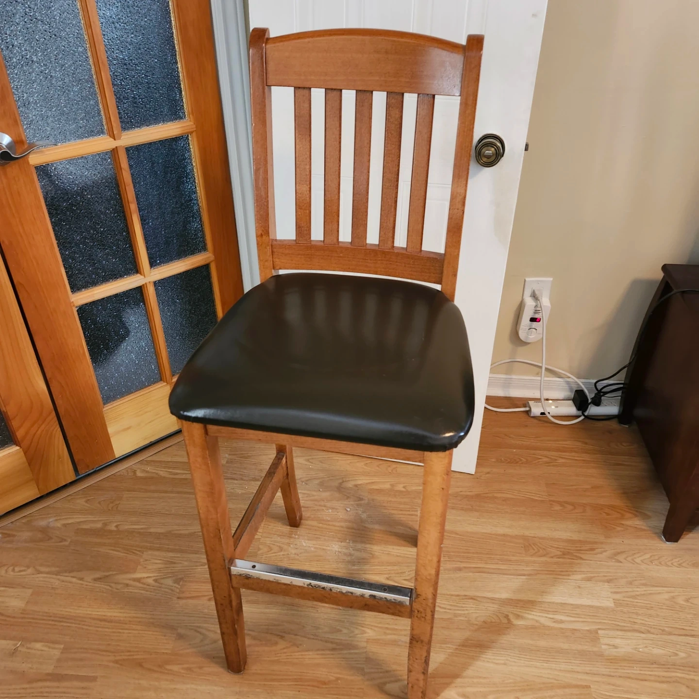 This is a sturdy wooden bar stool with a comfortable black padded seat. It's perfect for a kitchen island or home bar. The wooden frame offers a classic look.