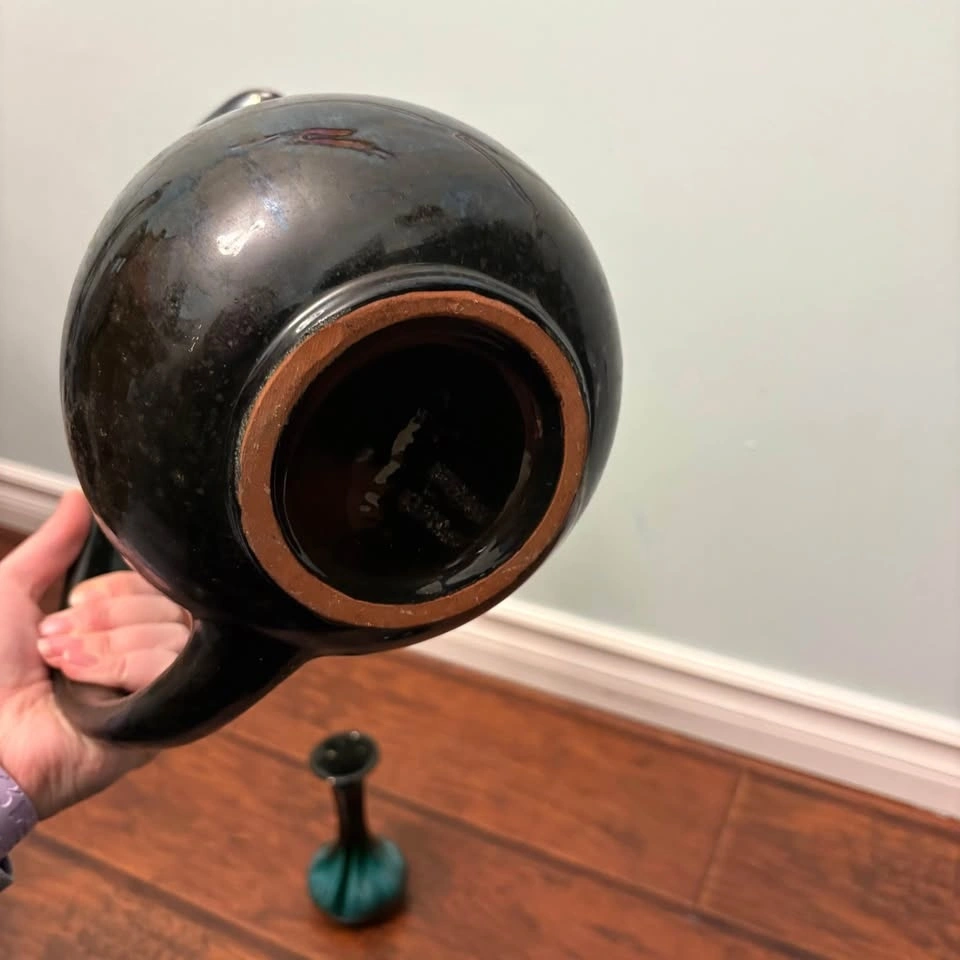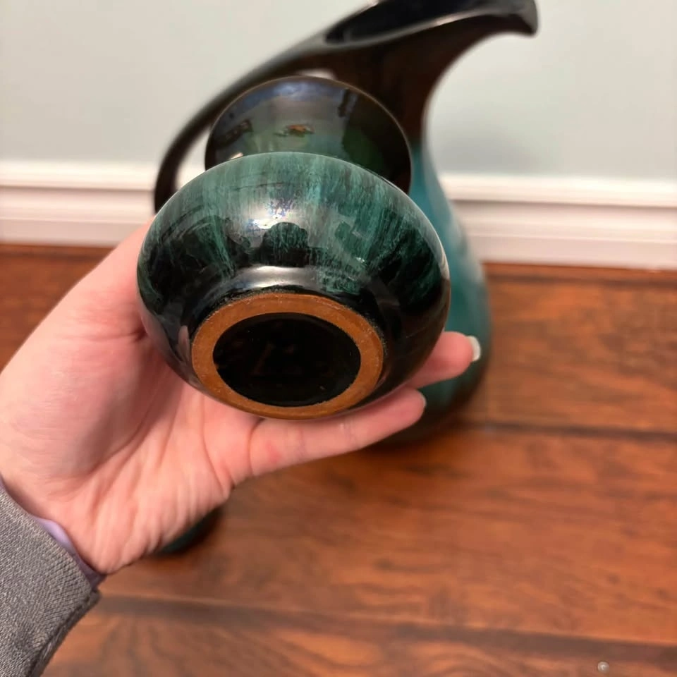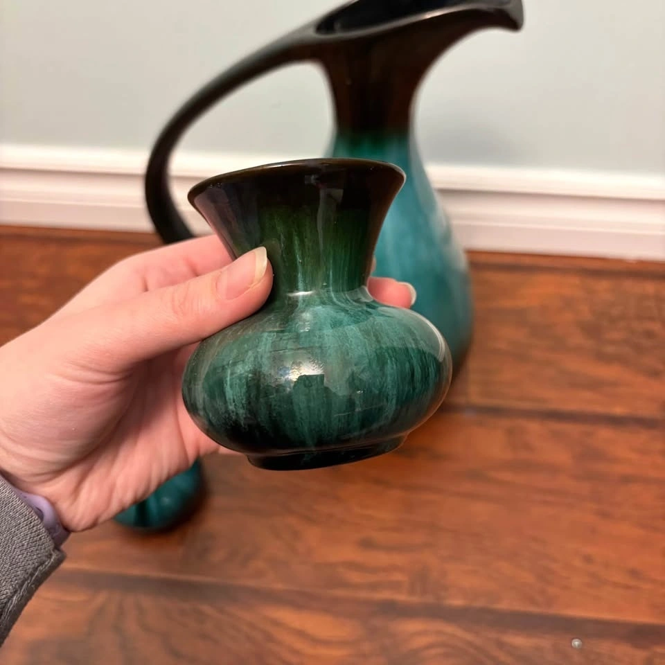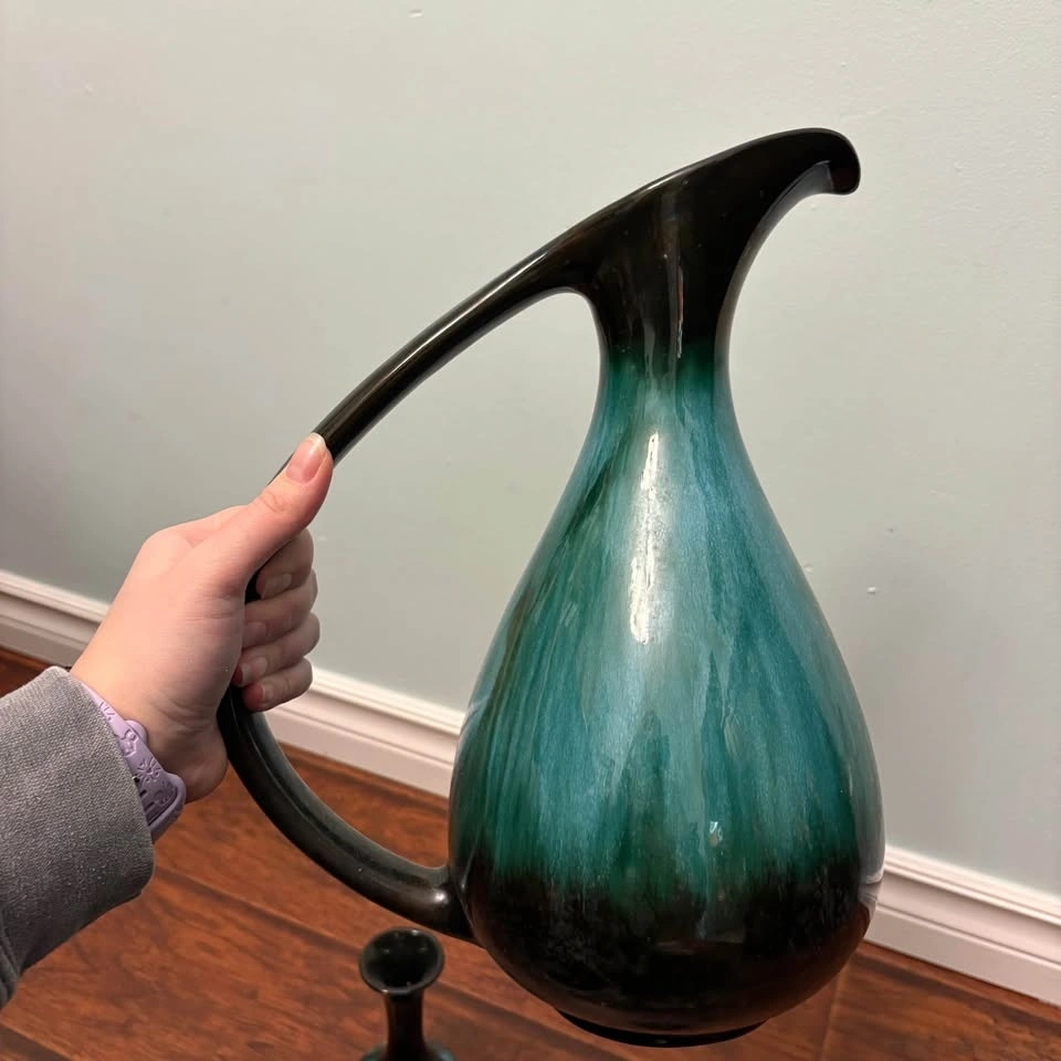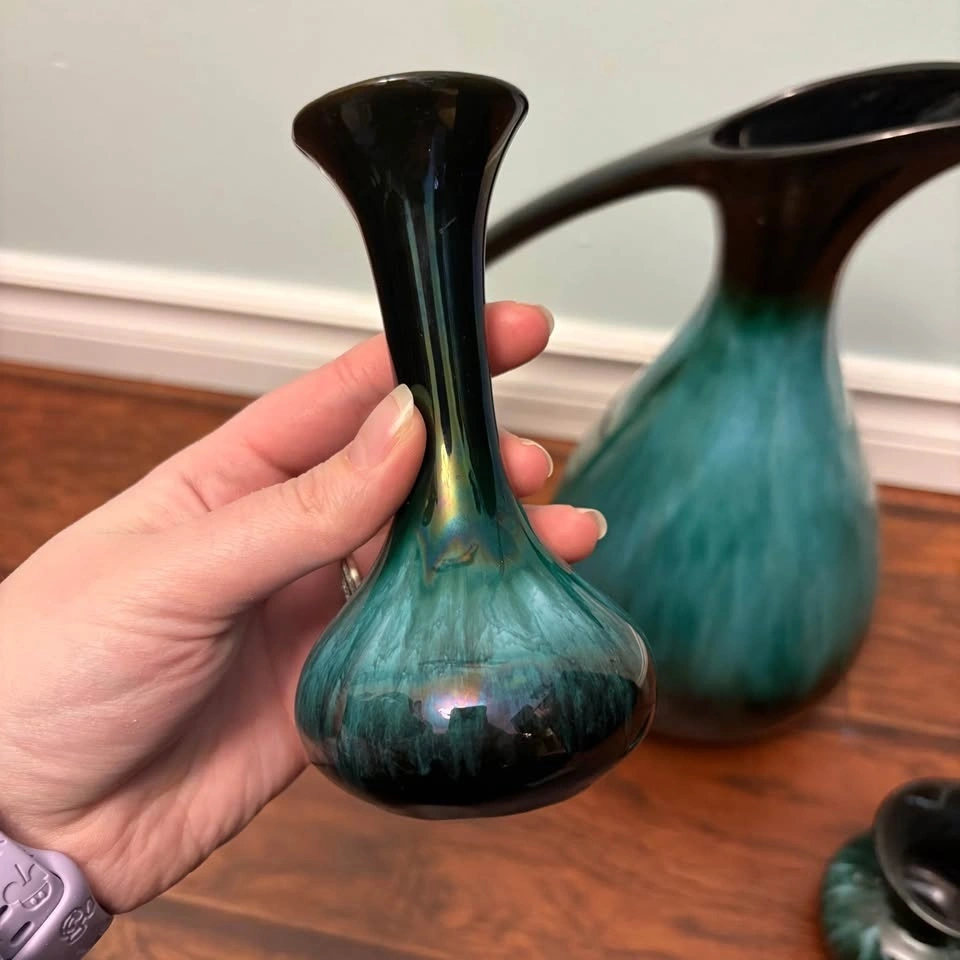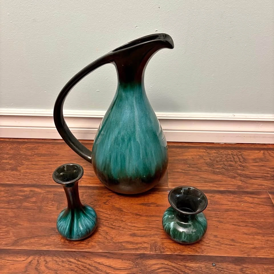 This is a set of vintage Canadian Blue Mountain Pottery in their iconic green and black drip glaze finish. The set includes a large pitcher with a long curved handle and two smaller matching vases or candle holders. Blue Mountain Pottery was produced in Ontario, Canada, from the 1960s until 2005. It is a collectible example of mid-century modern ceramic art.