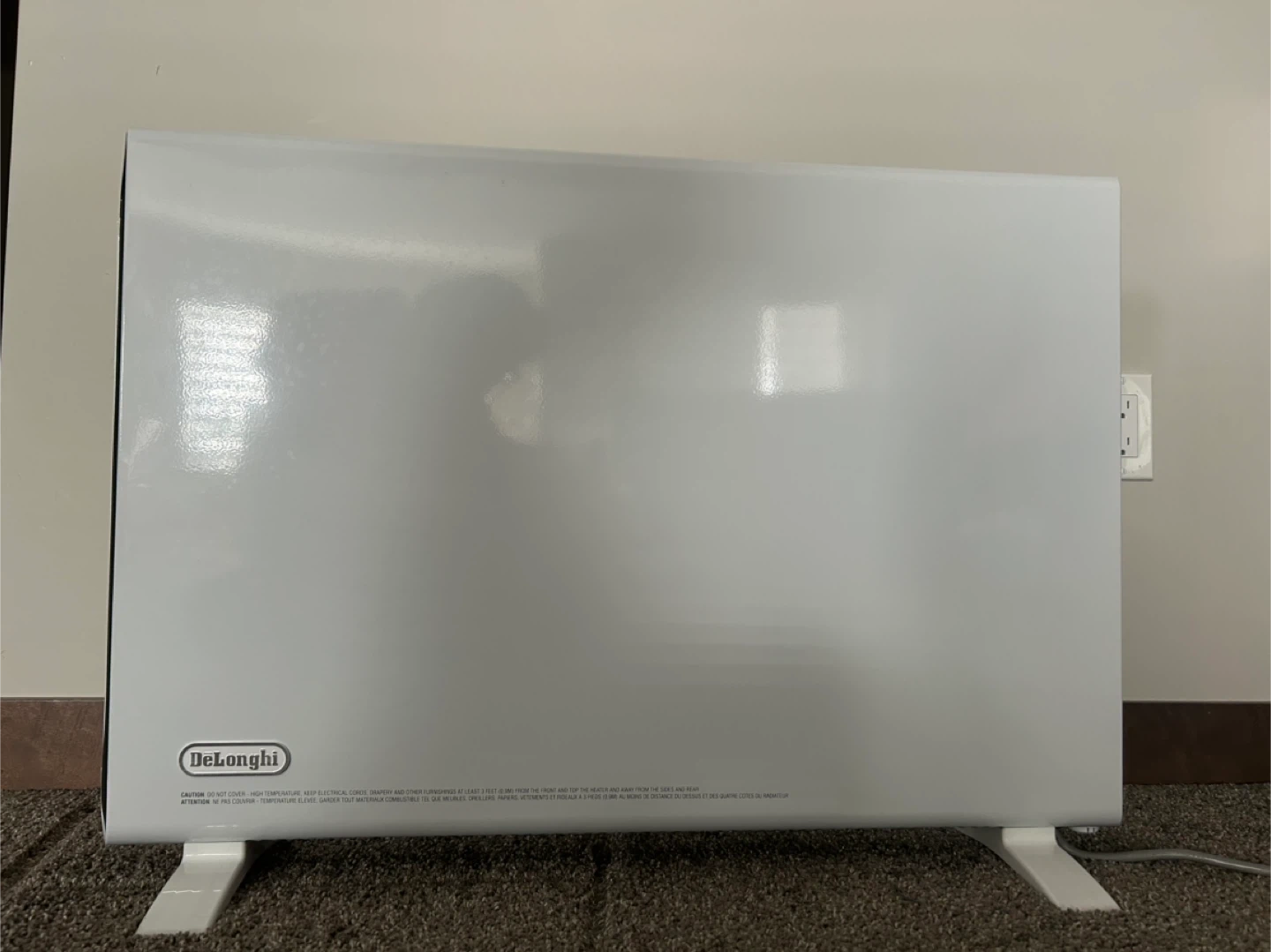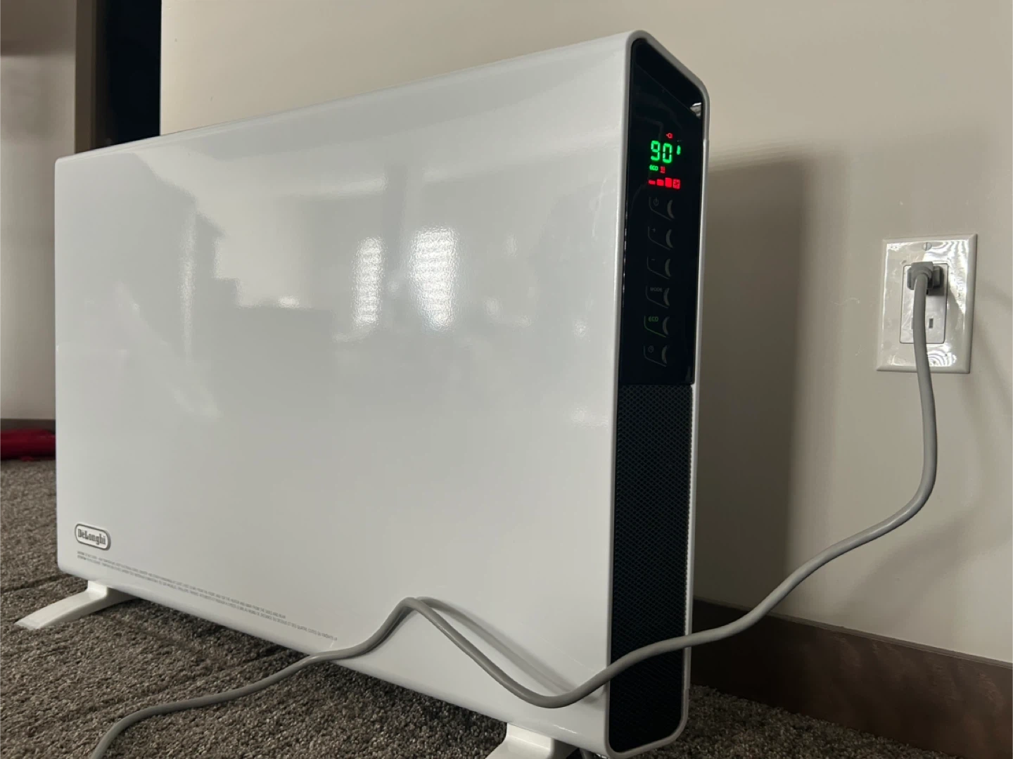 White DeLonghi convector heater with digital display. It's a portable unit with easy-to-use controls. Provides quick and efficient heating for any room.