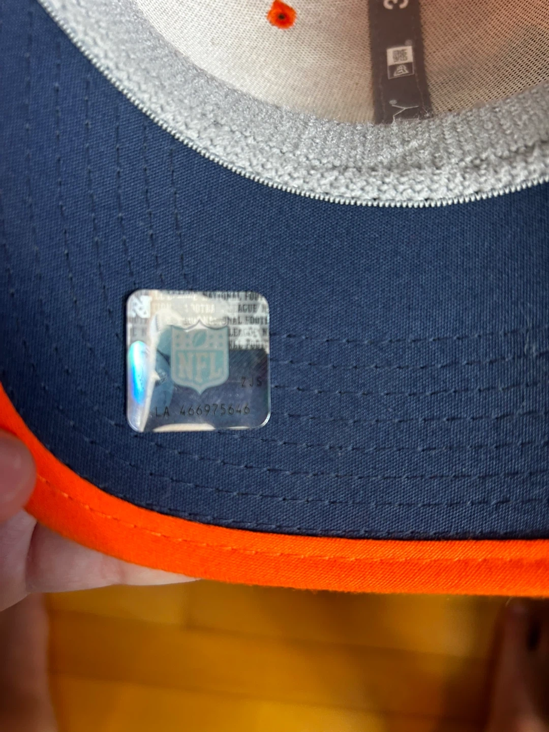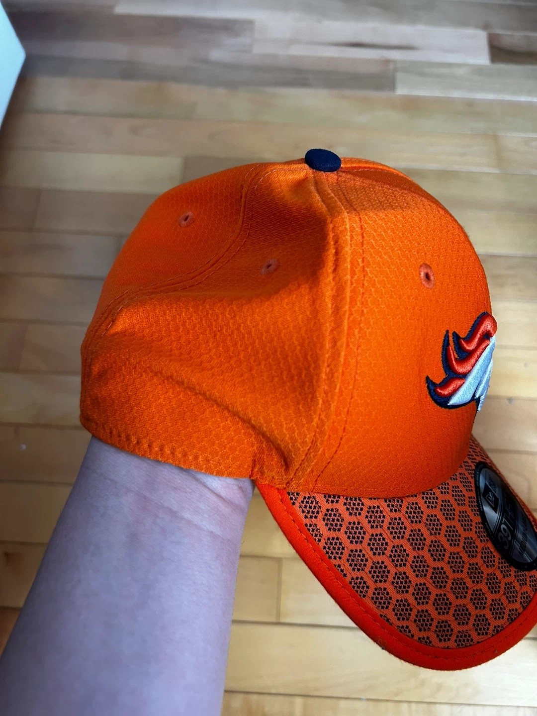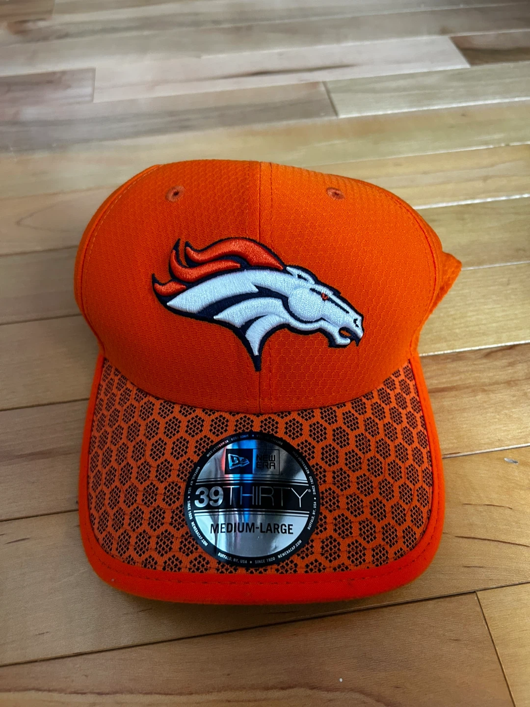 This is a New Era 39THIRTY cap featuring the Denver Broncos logo. It's size medium-large and orange. Show your team spirit with this officially licensed NFL hat!