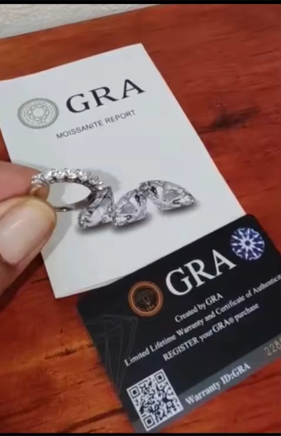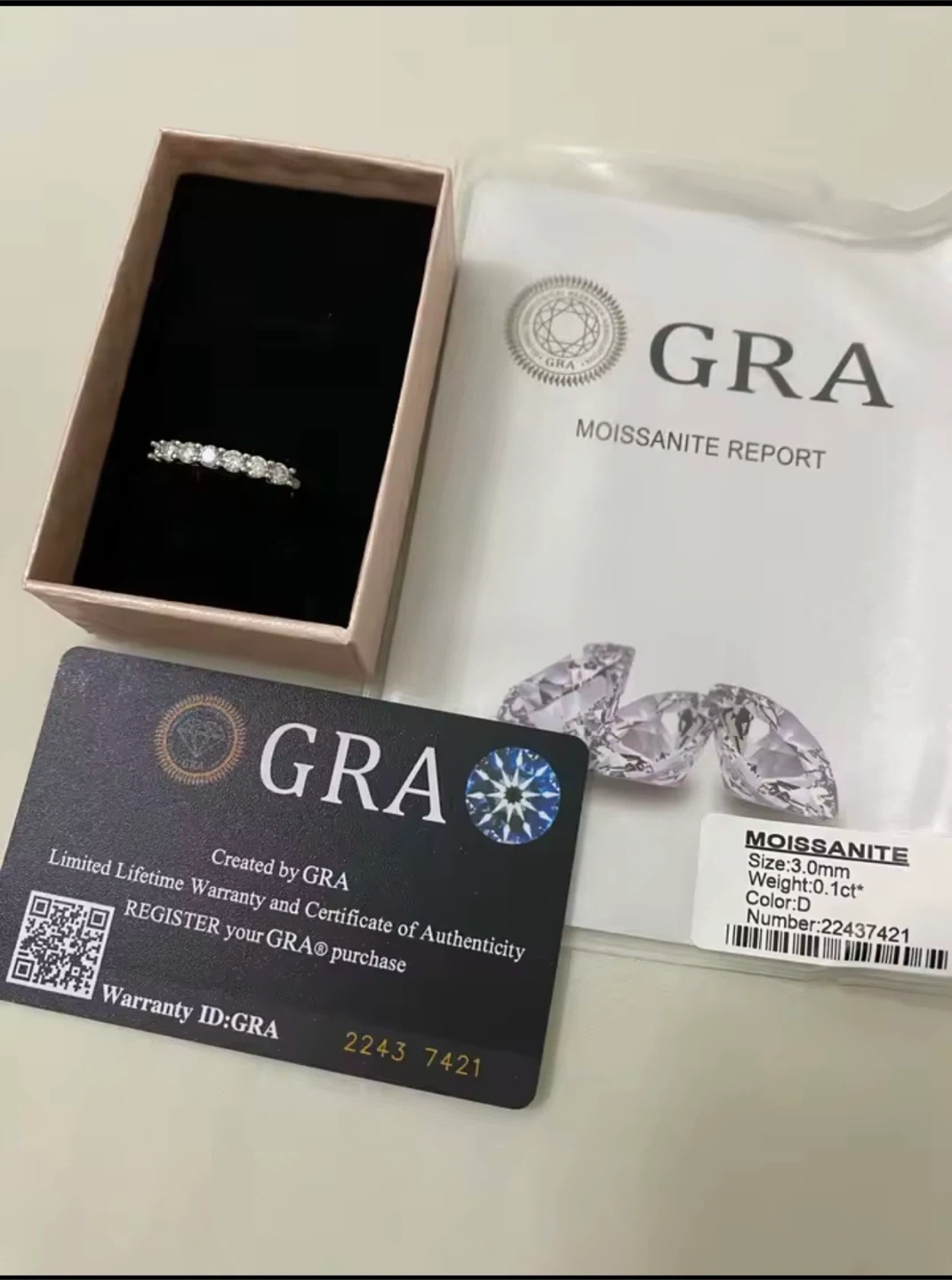This is a 100% moissanite ring set in S925 stamp . It includes a GRA certificate for authenticity. The ring features a 3-layer plating for durability and to prevent tarnishing. It's a classic band design with multiple stones. This ring would make a great gift or personal accessory.