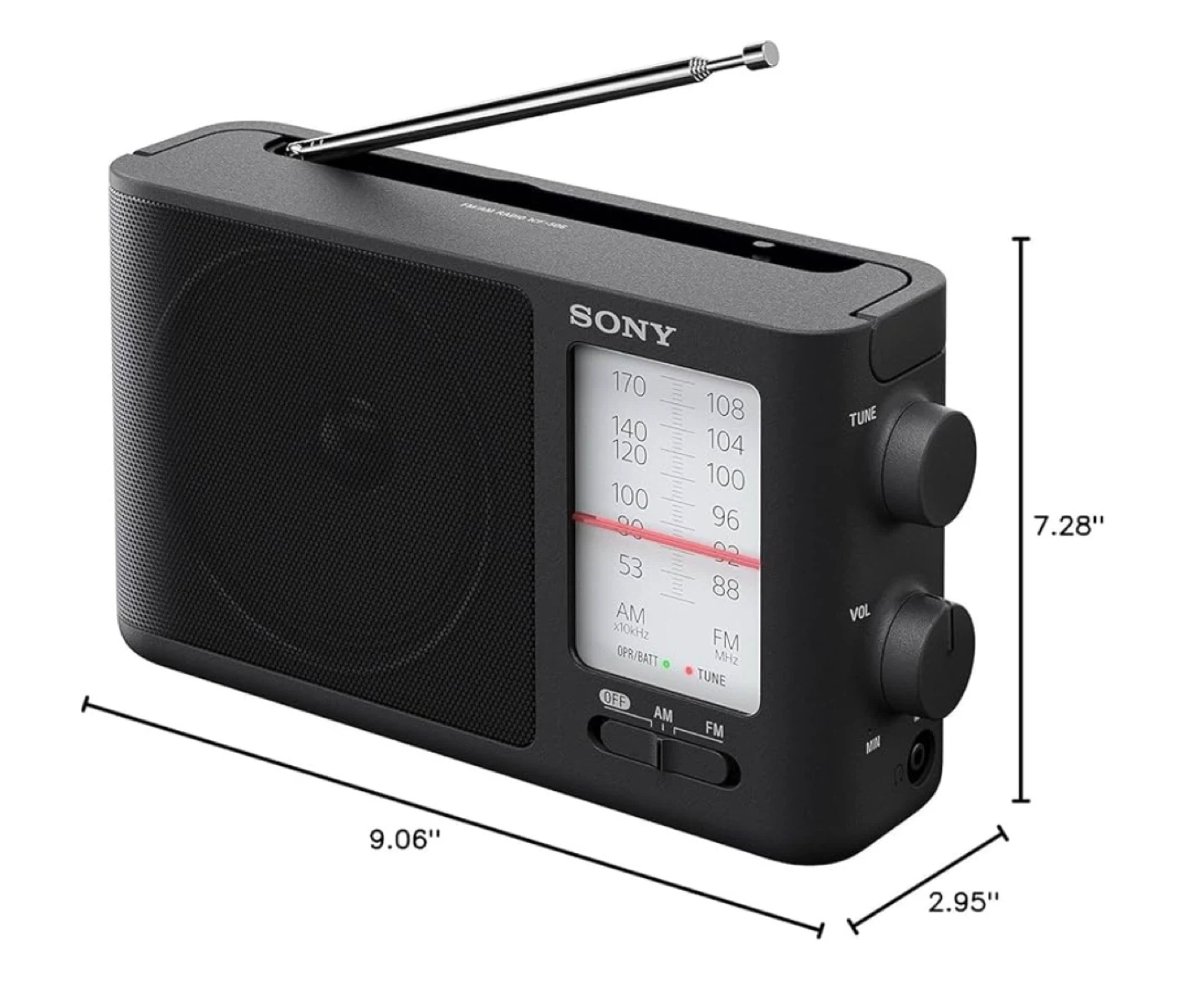 This is a black Sony ICF-506 AM/FM portable radio. It includes the original box and a power cord. The radio measures 9.06" W x 7.28" H x 2.95" D. It's great for listening to broadcasts on the go! Retro style radio plug in or battery operated for on the go listening. Good in the farm on outdoors